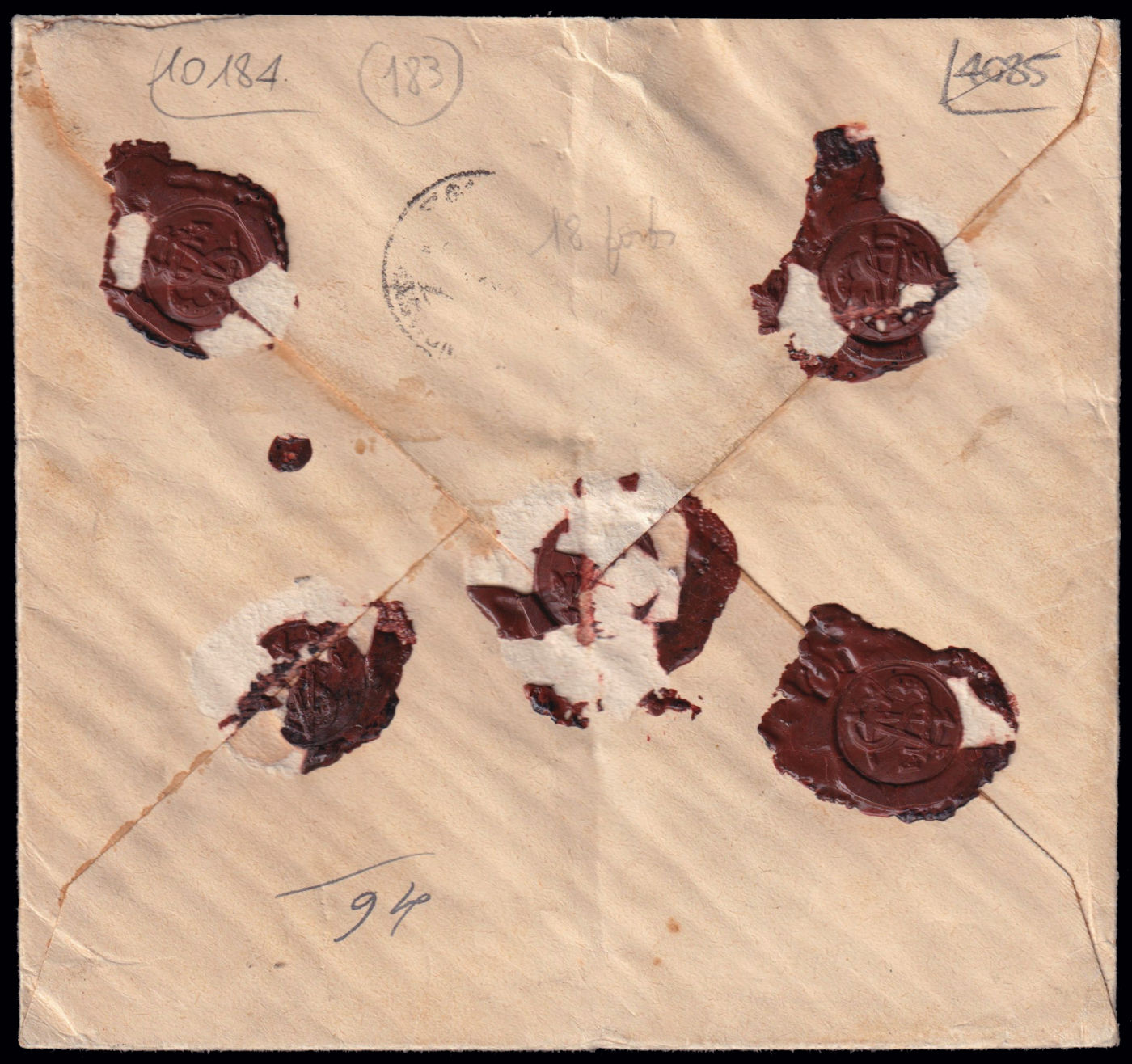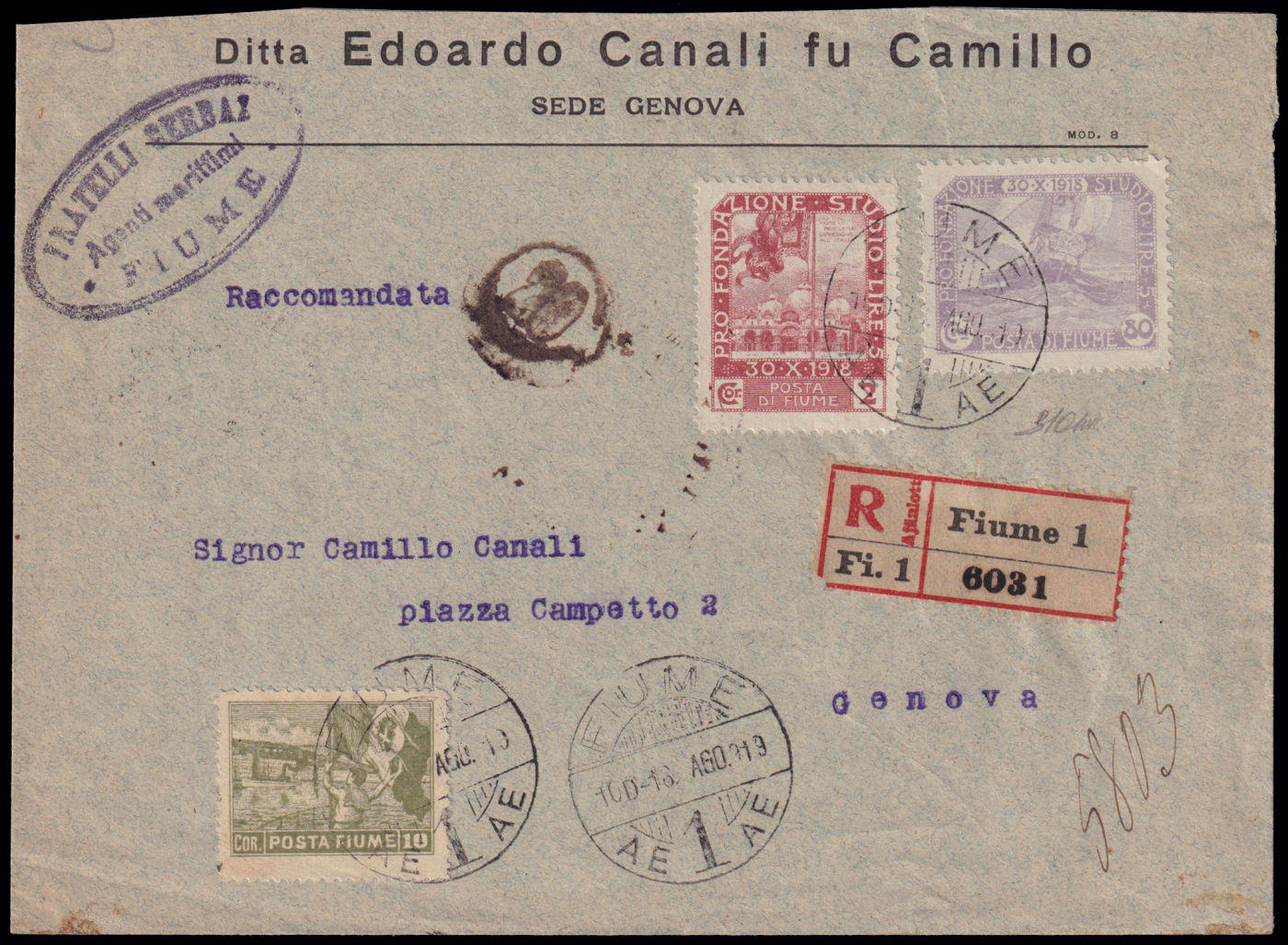 183 L imagePACCHI POSTALI. Raccomandata spedita a San Remo il 3/7/36 ed affrancata con un 5 centesimi ed un 25 c. Stampa Cattolica, un 25 centesimi Giuridico ed un esemplare da 10 lire con soprastampa "PER PACCHI" (n.13). Timbro di arrivo e ceralacca al retro. Raro. Ex. Fulcheris. (Image) (ImageA)