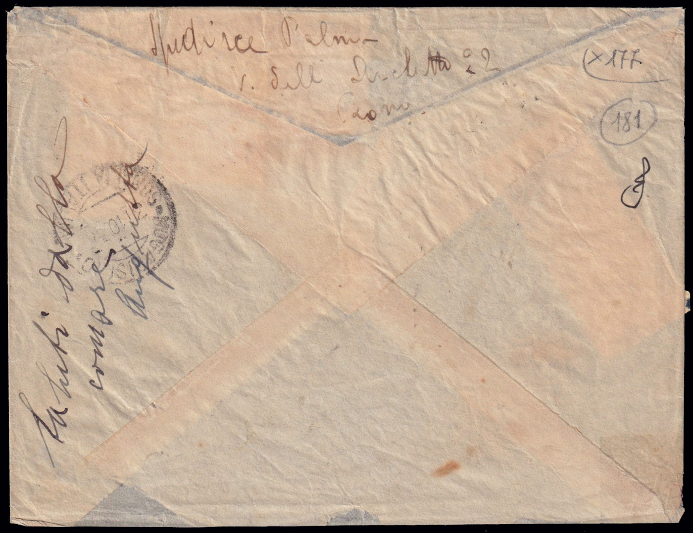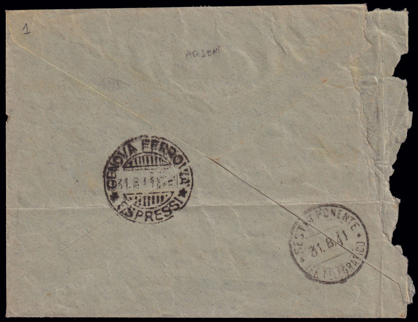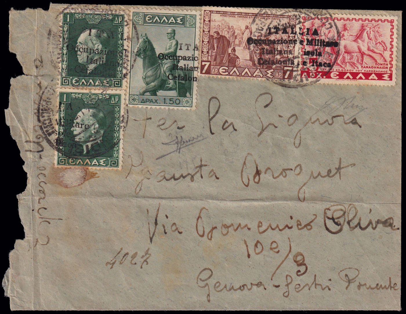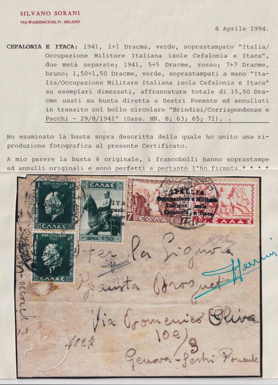 190 L imageEMISSIONI DI ARGOSTOLI E ITACA. Lettera espresso diretta a Sestri Ponente affrancata per comolessivi 15,5 dracme con le due sezioni separate del raro francobollo da 1 dracma verde con soprastampa a macchina di Argostoli (Sassone n.8) e 3 francobolli con soprastampa a mano di Itaca da 5 e 7 dracme serie Mitologica e un francobollo Mon Equestre da 1,50 dracme (Sassone 63+65+71) tutti annullati con il bollo di transito "Brindisi Corrispondenze e Pacchi 29/8/1941". Al retro timbro di transito di Genova espressi e arrivo a destino. Dettagliato certificato di garanzia Sorani (1994) e grande firma G.Oliva. Rarissima corrispondenza non filatelica che presenta combinazione mista Argostoli e Itaca, inoltrata per espresso (la tariffa espresso corrispondeva a 10 dracme e la tariffa ordinaria a 8 dracme ma quasi tutte le corrispondenze viaggiate non avevano una corretta affrancazione). (Image) (ImageA) (ImageB)