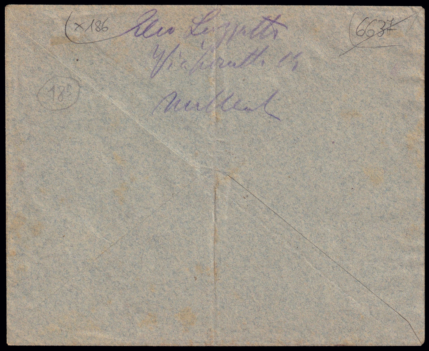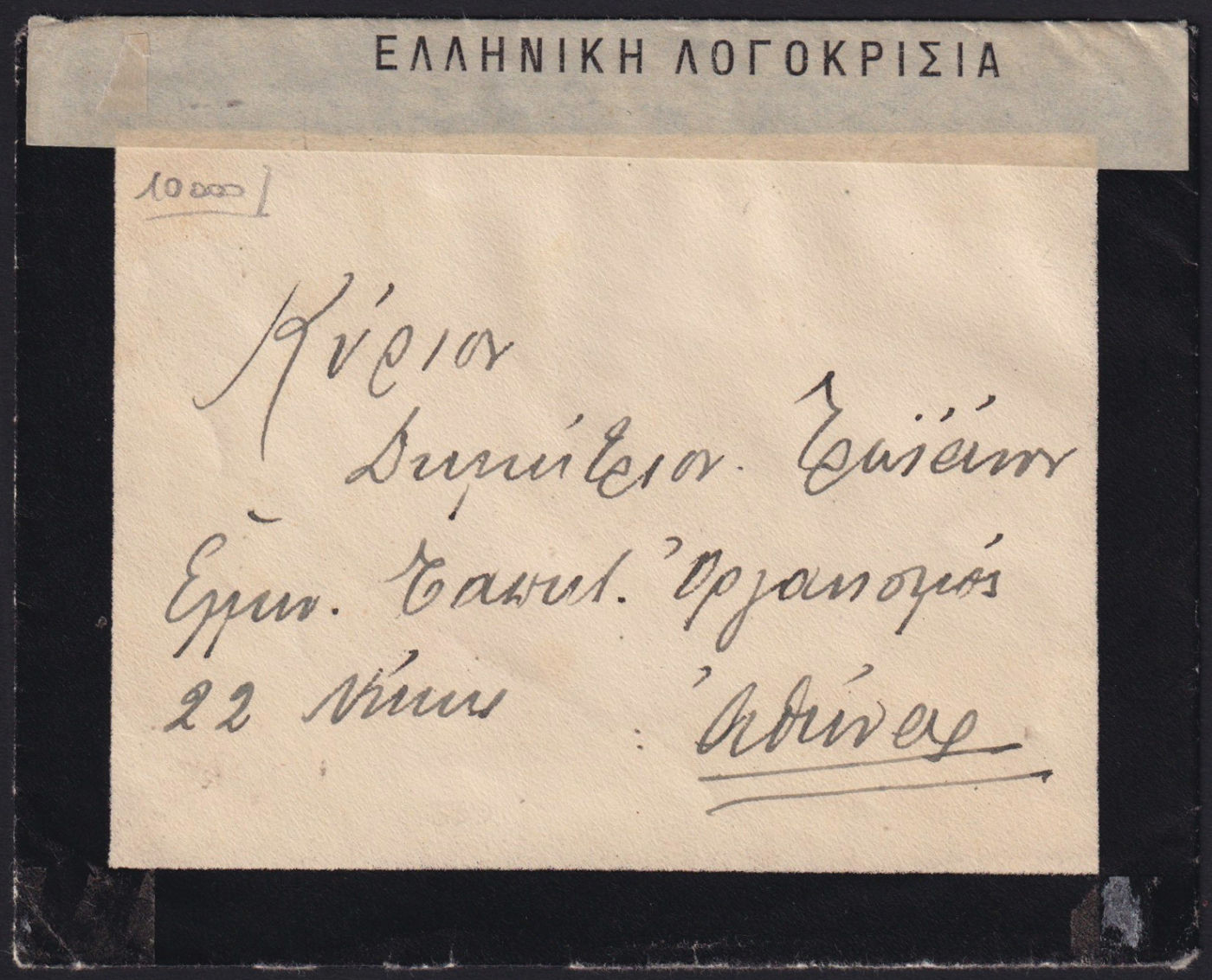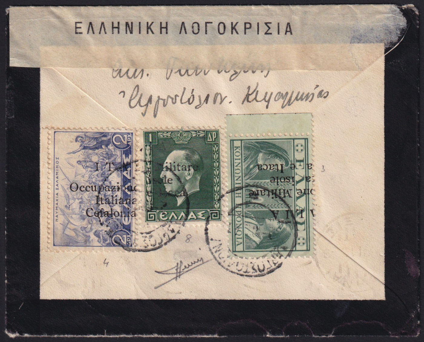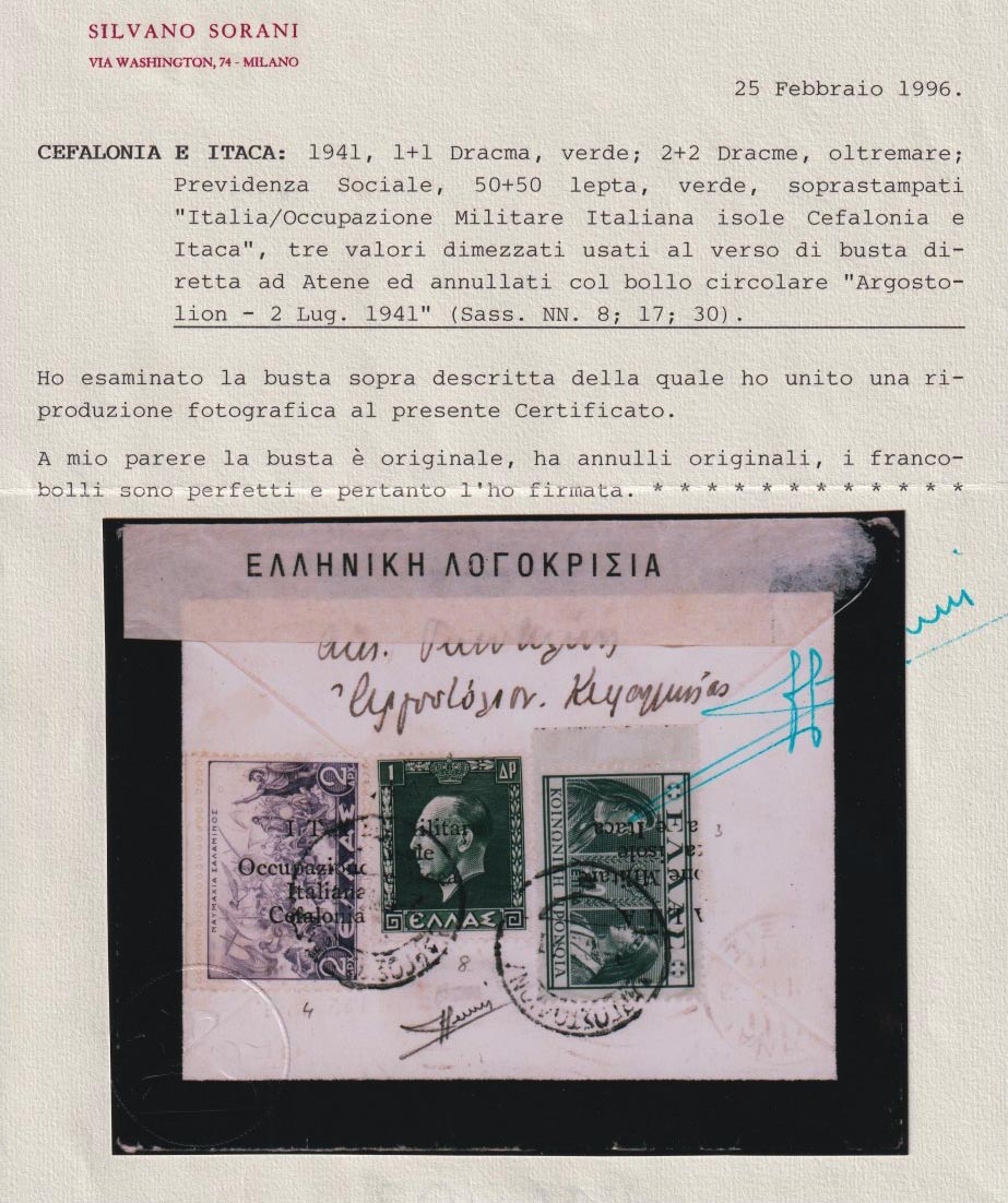 191 L imageEMISSIONE DI ARGOSTOLI. Lettera spedita da Argostoli il 2/7/1941 affrancata in perfetta tariffa per l'interno della Grecia 3 dracme con due francobolli soprastampati "ITALIA Occupazione Militare Italiana isole Cefalonia e Itaca" a macchina da 1d. e da 2d. unitamente a francobollo da 50 lepta per Previdenza Sociale obbligatorio per le corrispondenze interne (Sassone nn.8+17+30), annullati col guller postale e timbro di arrivo a lato e fascetta di censura. Dettagliato certificato Sorani (1996). Una delle pochissime corrispondenze non filateliche in tariffa con i francobolli soprastampati. (Image) (ImageA) (ImageB)