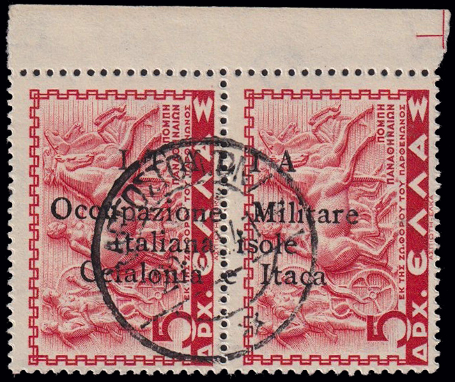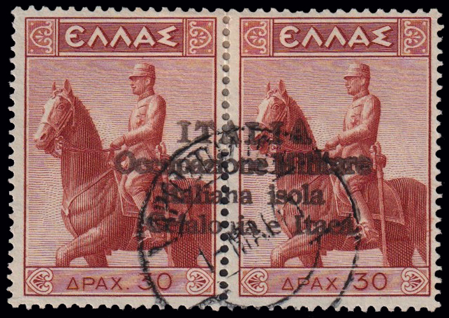 193 U imageEMISSIONE DI ARGOSTOLI. Soprastampa a mano "ITALIA Occupazione Militare Italiana isola Cefalonia e Itaca" su coppia orizzontale del francobollo Mon. Equestre da 30d (n.72), annullato. Firma di garanzia G. Oliva. (Image) (ImageA)
