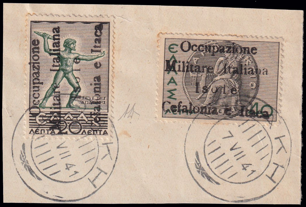 194 F imageEMISSIONE DI ITACA. Mitologica, grande brano di lettera affrancato con 2 francobolli con soprastampa a mano "Occupazione Militare Italiana Isole Cefalonia e Itaca" rispettivamente da 20l. e 40l. (nn.30+31) annullati in data 7/7/41. Firma di garanzia A. Diena. Raro. (Image) (All Images)