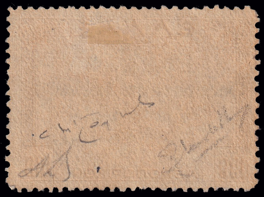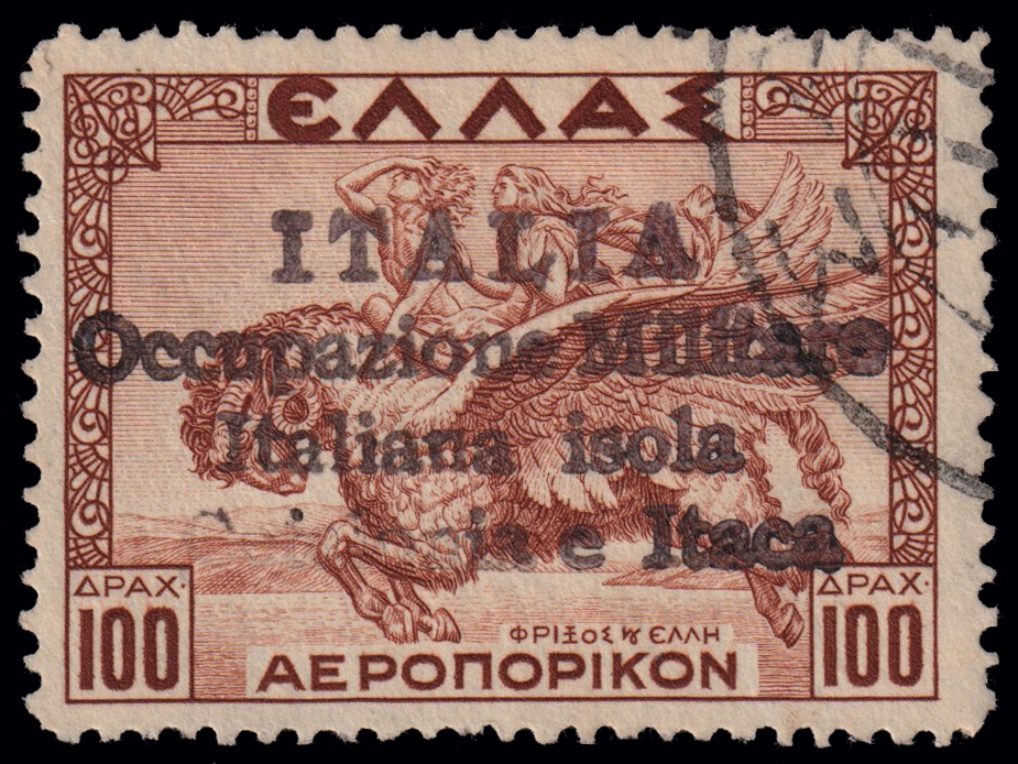 195 U imageEMISSIONE DI ARGOSTOLI. L'alto valore da 100d. di posta aerea (n.PA23) con soprastampa a mano che presenta solamente le ultime due lettere (ia) della parola Cefalonia che quindi è quasi del tutto mancante, annullato. Firme di garanzia Raybaudi. A,Diena e R. Mondolfo. Varietà NON CATALOGATA. Due soli 100d. esistenti, a noi noti, con tali caratteristiche. (Image) (ImageA)