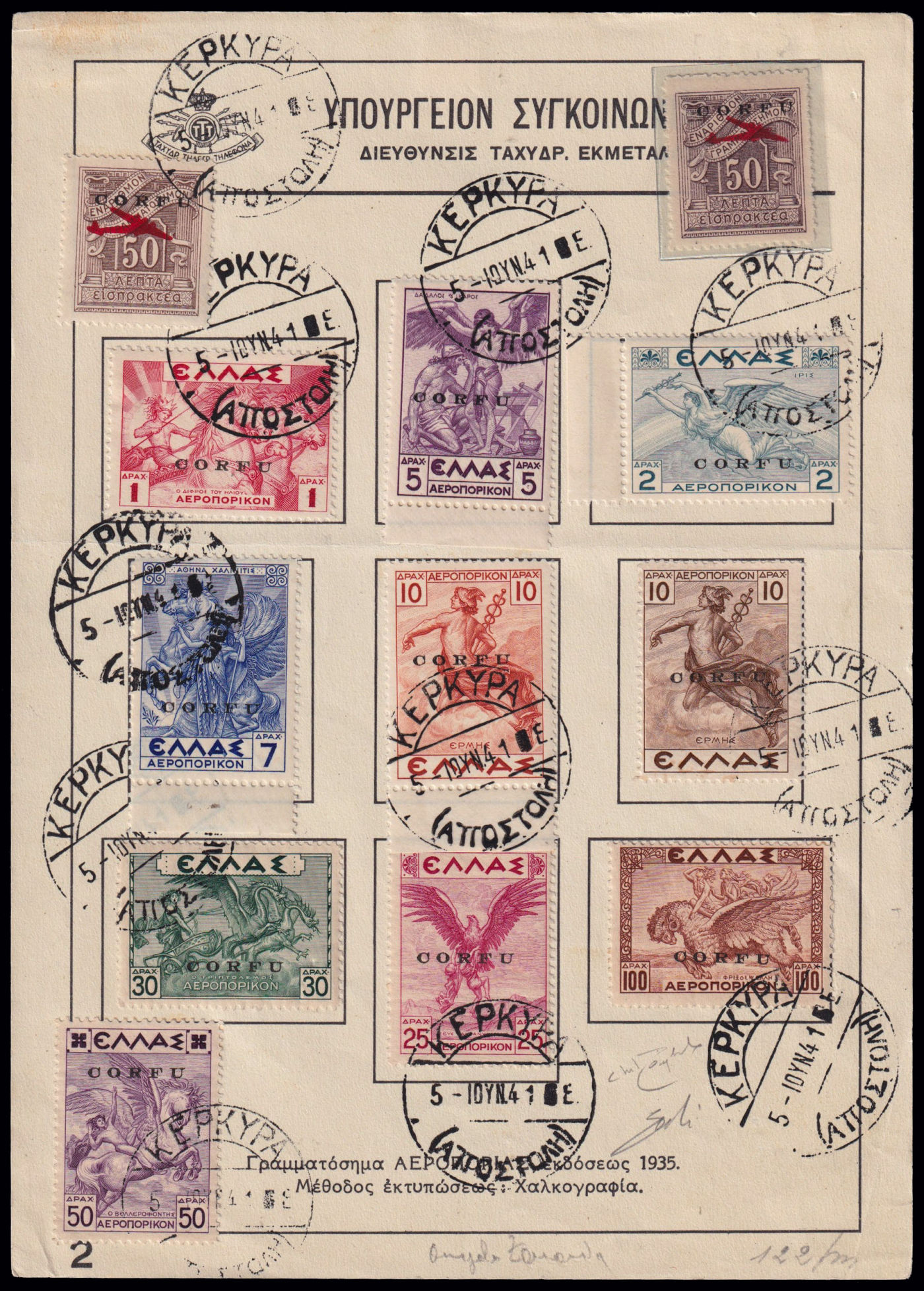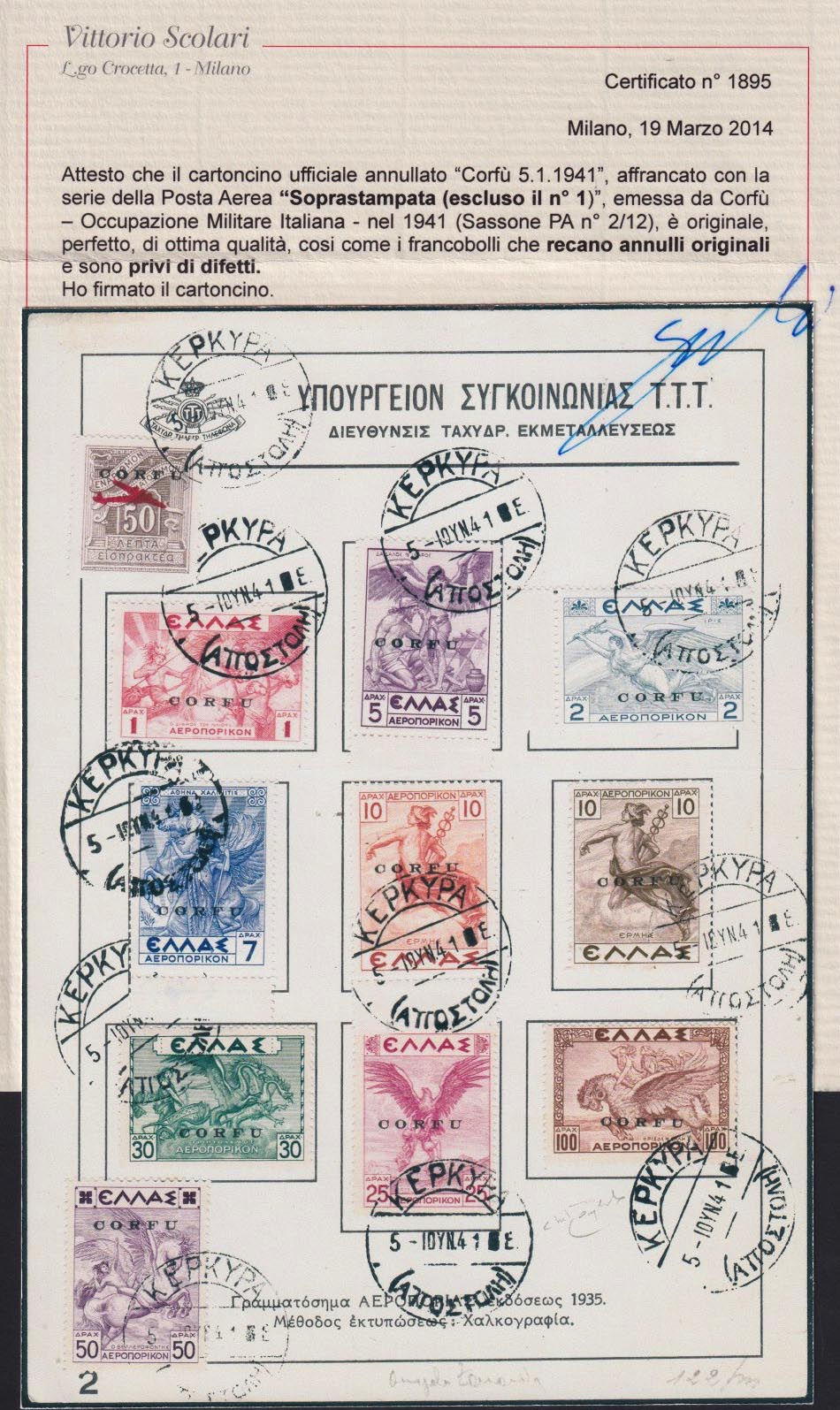 198 F image1941 POSTA AEREA. Cartoncino ufficiale delle poste con la serie di 11 francobolli soprastampati CORFU' annullati in data 5/6/1941 ed il 50l bruno nuovo. Firme di garanzia Raybaudi, A. Zanaria e certificato Scolari. (Image) (ImageA)
