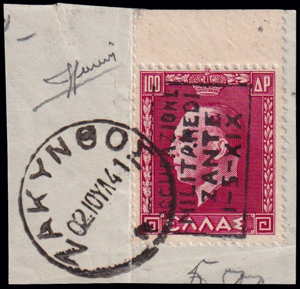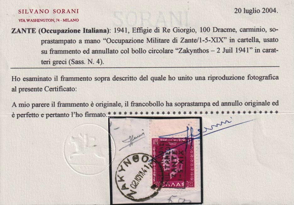 199 F image1941 EFFIGIE DI GIORGIO II. L' alto valore da 100d. con rara soprastampa nera (n.4), annullato su grande frammento. Dettagliato certificato Sorani (2004). L'alto valore della I° serie è quasi sempre soprastampato in inchiostro viola. (Image) (ImageA)