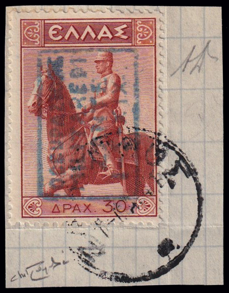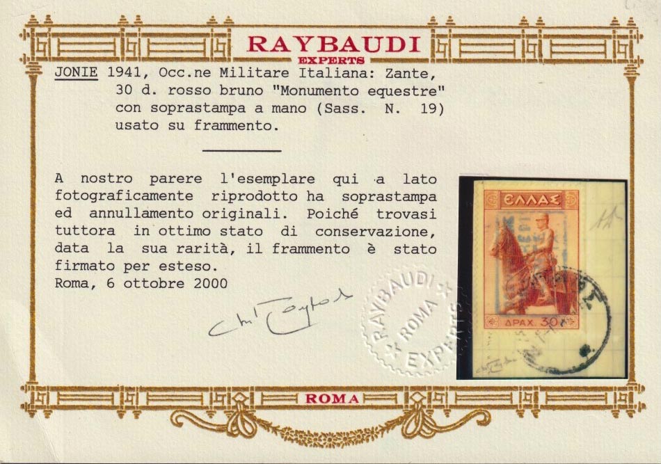 200 F image1941 MONUMENTO EQUESTRE. Il rarissimo francobollo da 30d. (n.19) con soprastampa azzurra solitamente impressa sui segnatasse, annullato su frammento completo. Firma di garanzia A. Diena e dettagliato certificato "oro" Raybaudi (2000). Insieme probabilmente unico. (Image) (ImageA)