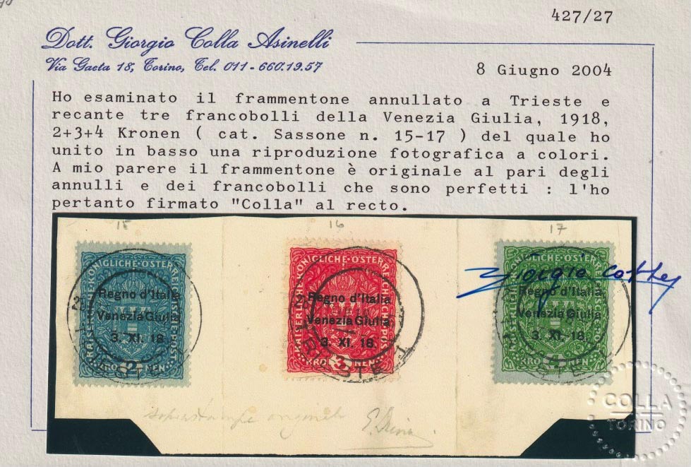 186 F imageFRANCOBOLLI D'AUSTRIA CON SOPRASTAMPA TIPOGRAFICA. I tre alti valori soprastampati Regno d'Italia Venezia Giulia 3. XI. 18. su tre righe (nn.15/17), annullati su grande frammento. Firme di garanzia Em. Diena e dettagliato certificato Colla (2004). (Image) (ImageA)