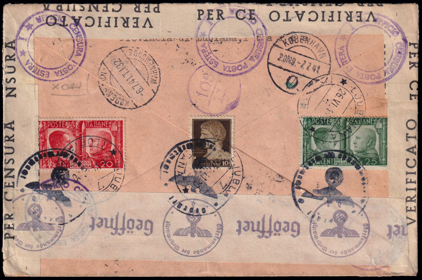 189 L imageDESTINAZIONE DANIMARCA. Busta raccomandata espresso via aerea spedita il 25/6/41 da Lubiana per Kopenhagen ed affrancata con combinazione mista di francobolli soprastampati "R. Commissariato" e "Co. Ci." oltre ad alcuni valori non soprastampati del Regno d'Italia. Fascette e timbri di censura e bollo di arrivo. (Image) (ImageA)