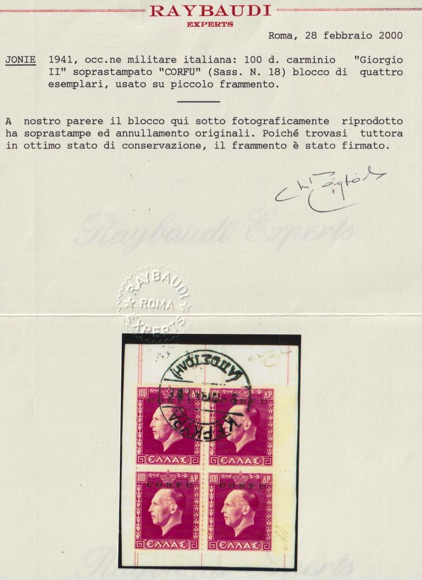 197 F image1941 EFFIGIE DI GIORGIO II. La serie di 4 valori soprastampati CORFU' in blocchi di 4, annullati su frammento (nn.15/18). Certificato Raybaudi (2000). Rari multipli. (Image) (ImageA)