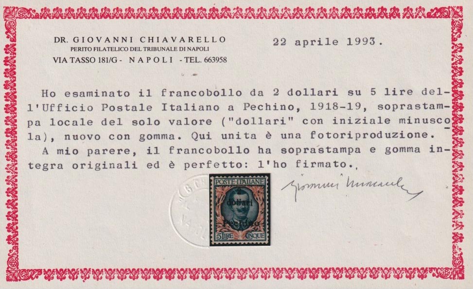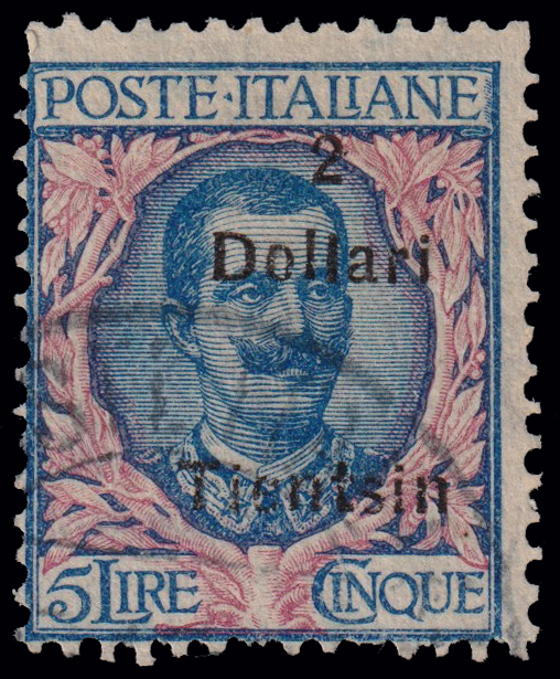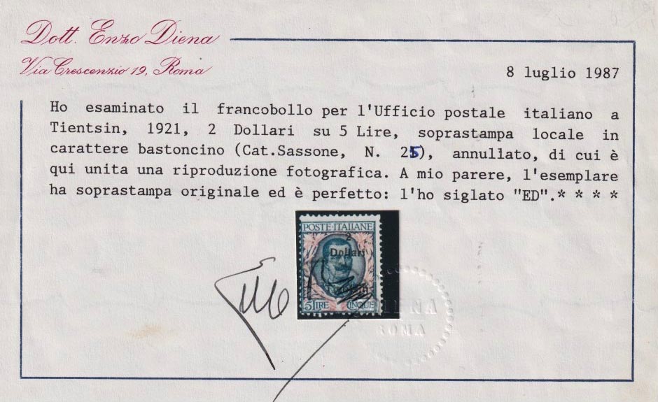 225 U imageSOPRASTAMPA A MANO - ALTO VALORE. Francobollo da 2 dollari su 5 lire con la soprastampa locale in carattere bastoncino (Sassone n.25), annullato. Dettagliato certificato E.Diena (1987) e firma di garanzia Oliva. (Image) (ImageA) (ImageB)