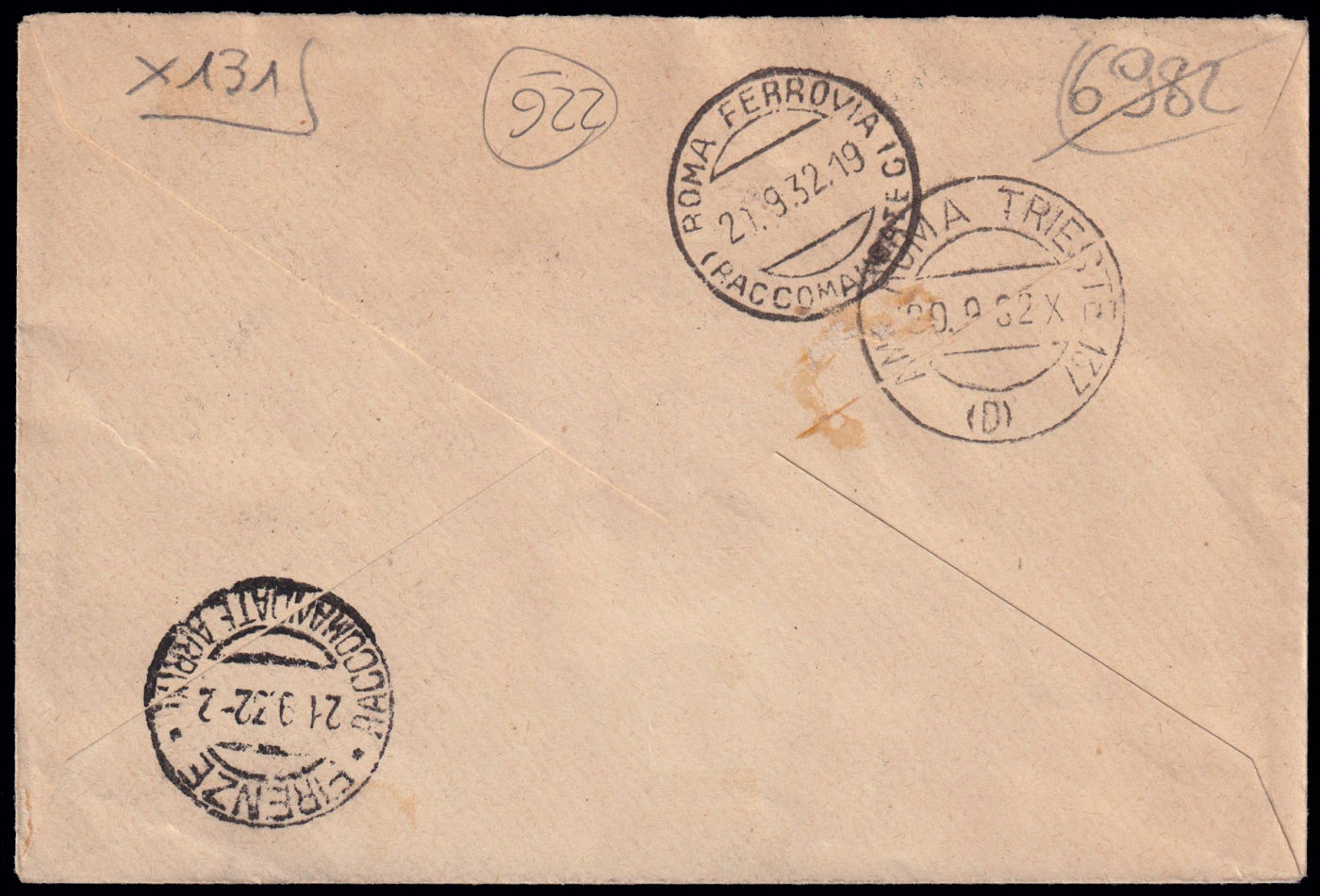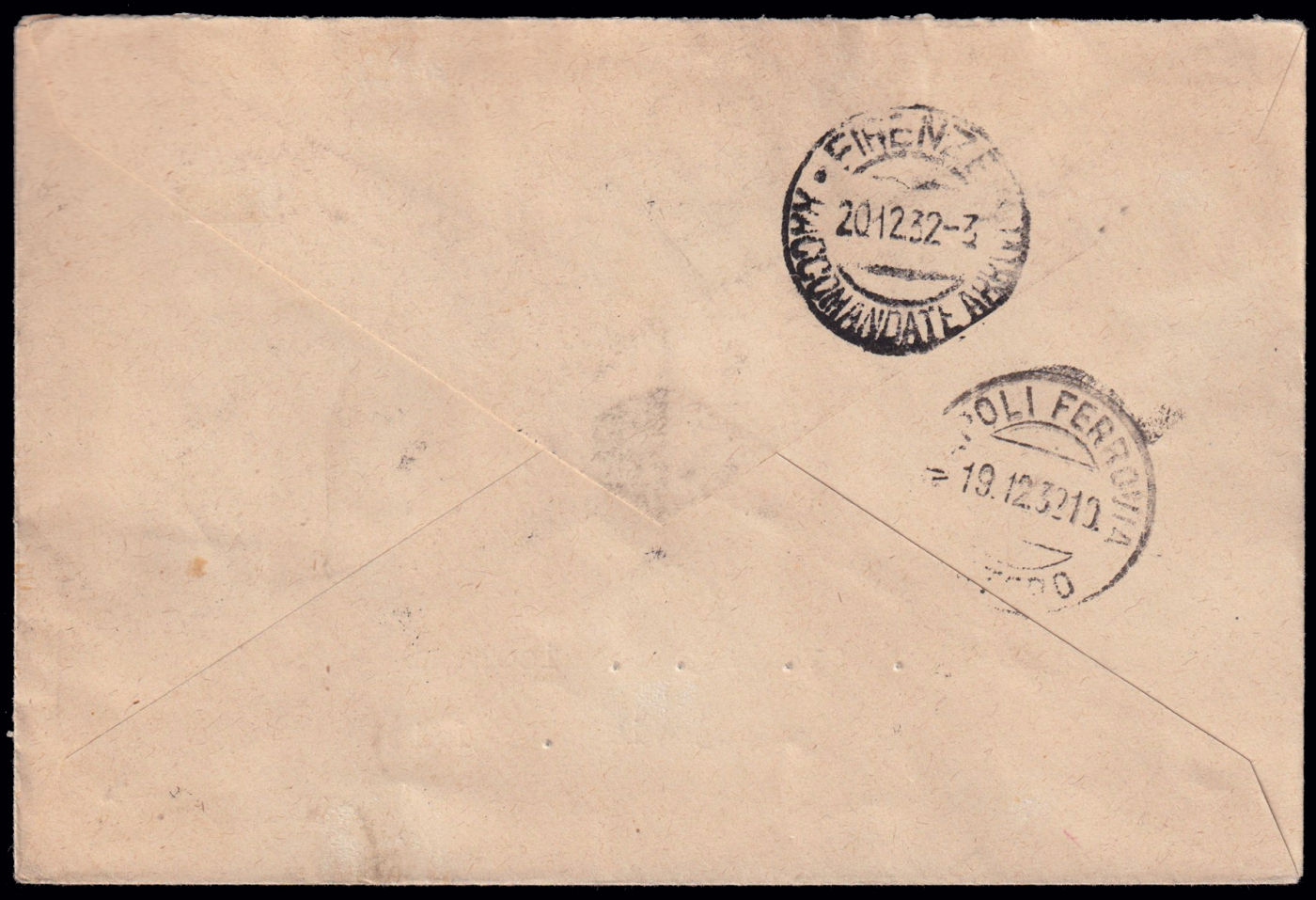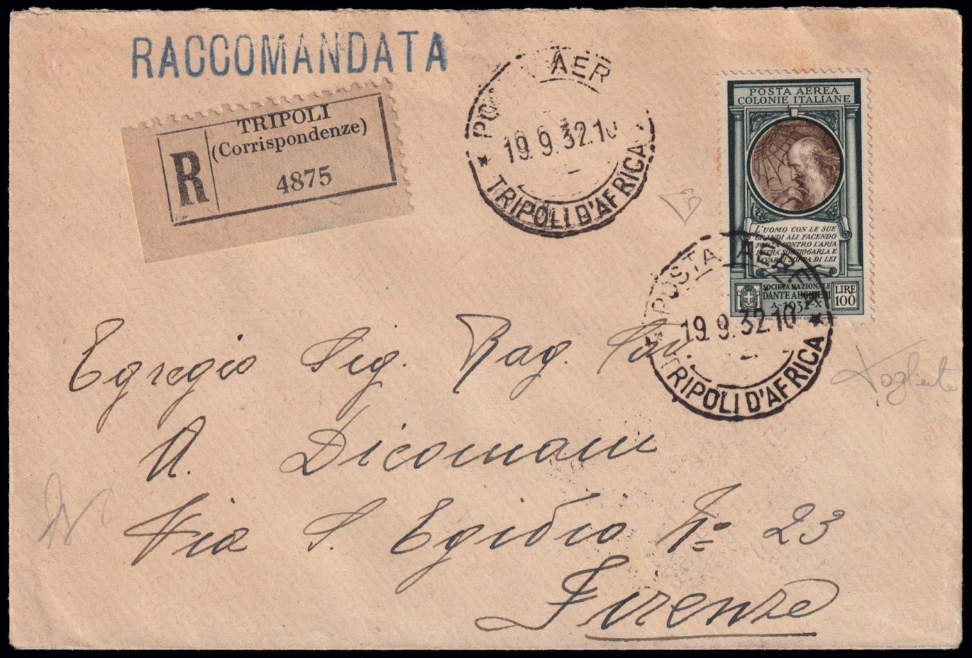 226 L imageSOCIETA' DANTE ALIGHIERI. Lettera raccomandata spedita via aerea da Tripoli per Firenze il 19/9/32 ed affrancata con l'alto valore da 100. Timbri arrivo. Firma di garanzia E. Diena. (Image) (ImageA)