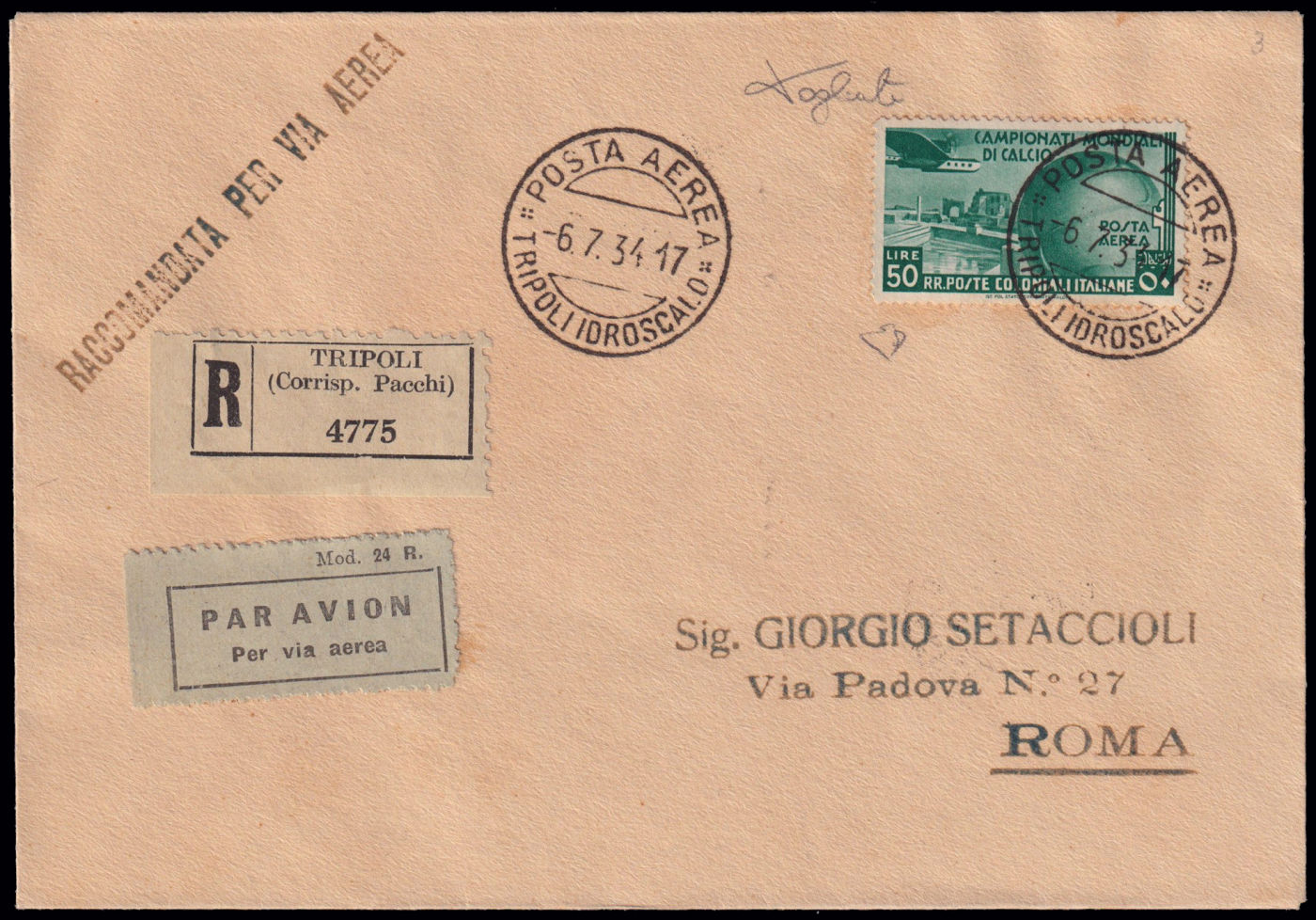 227 L imageCAMPIONATI DEL MONDO DI CALCIO. Aerogramma spedito da Tripoli per Roma il 6/7/34 affrancato con l'alto valore da 50 lire di posta aerea. Timbro di arrivo. Firme di garanzia E. Diena. (Image) (ImageA)
