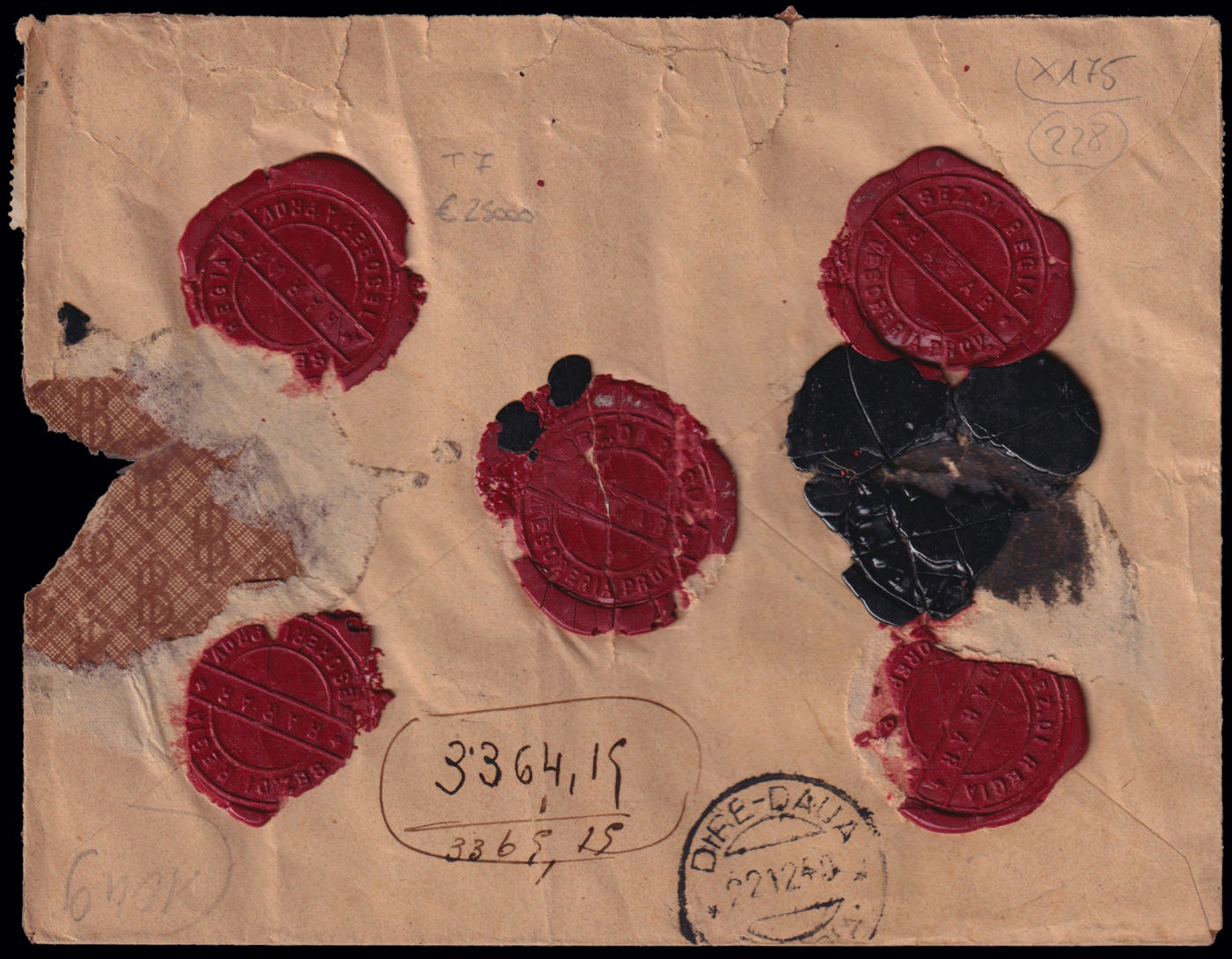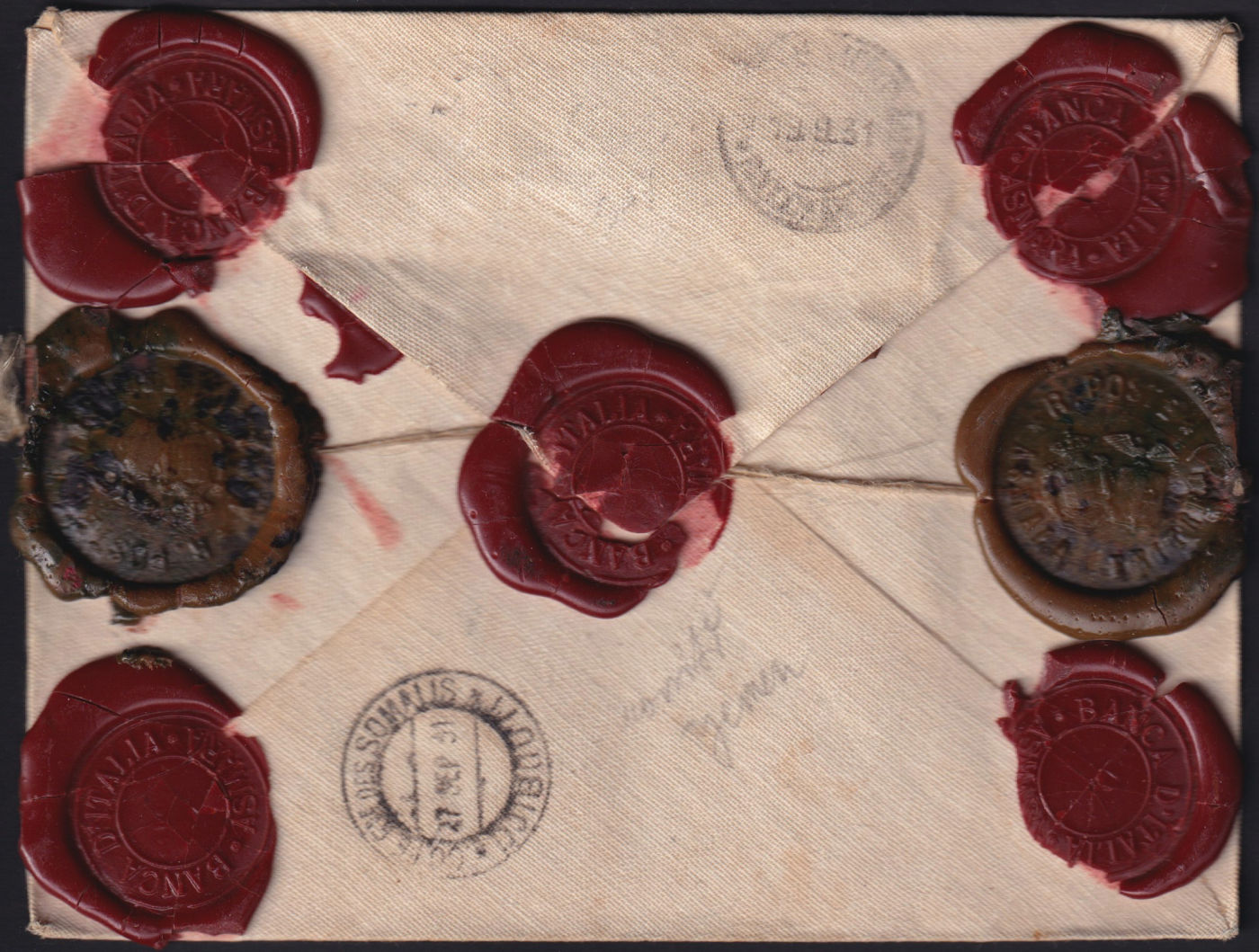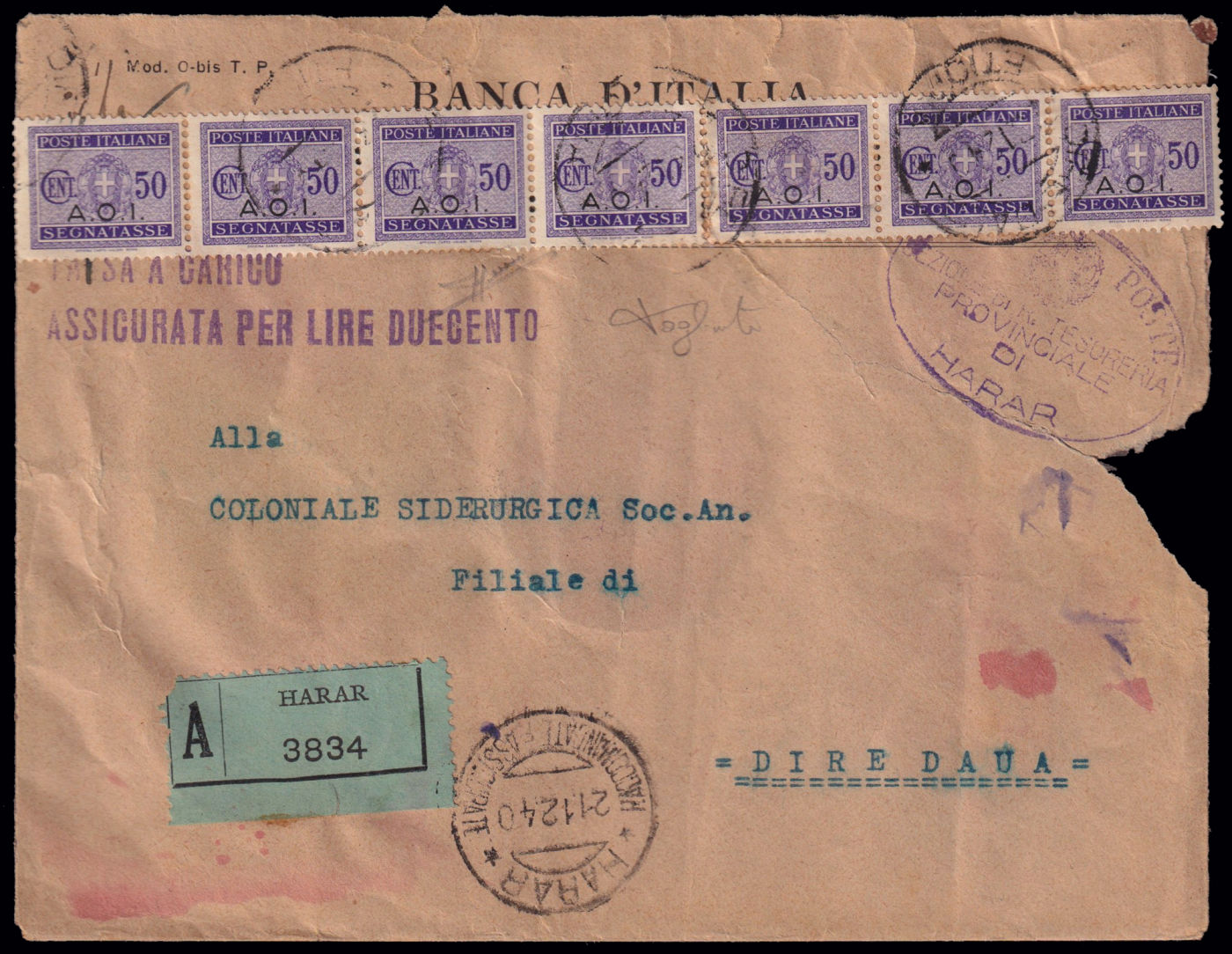 228 L imageASSICURATA CON TASSA A CARICO PER L'INTERNO. Busta assicurata per lire 200 spedita dalla filiale dell Banca d'Italia di Harar per Dire Daua il 21/12/40 e tassata a carico del destinatario per 3,50 lire con eccezionale striscia orizzontale di 7 segnatasse da 50 centesimi soprastampa ti (n.7). annullati col guller postale 23/12/40. Busta strappata a destra ma francobolli privi di difetti. Al retro timbri di transito e sigilli di ceralacca. Da annoverare fra le massime rarità di storia postale dell'ultimo periodo coloniale italiano. (Image) (ImageA)