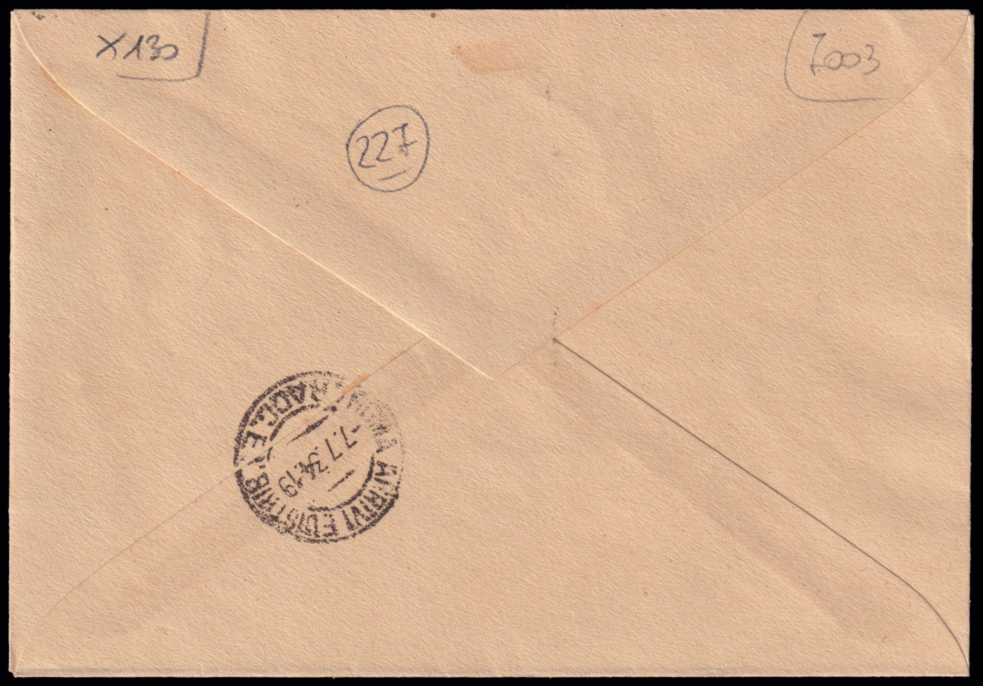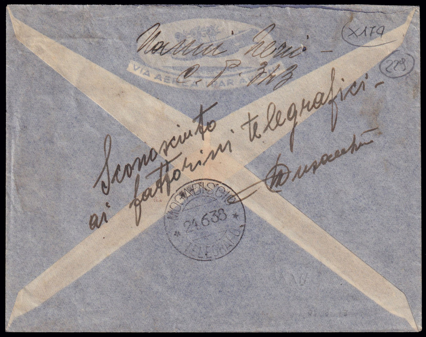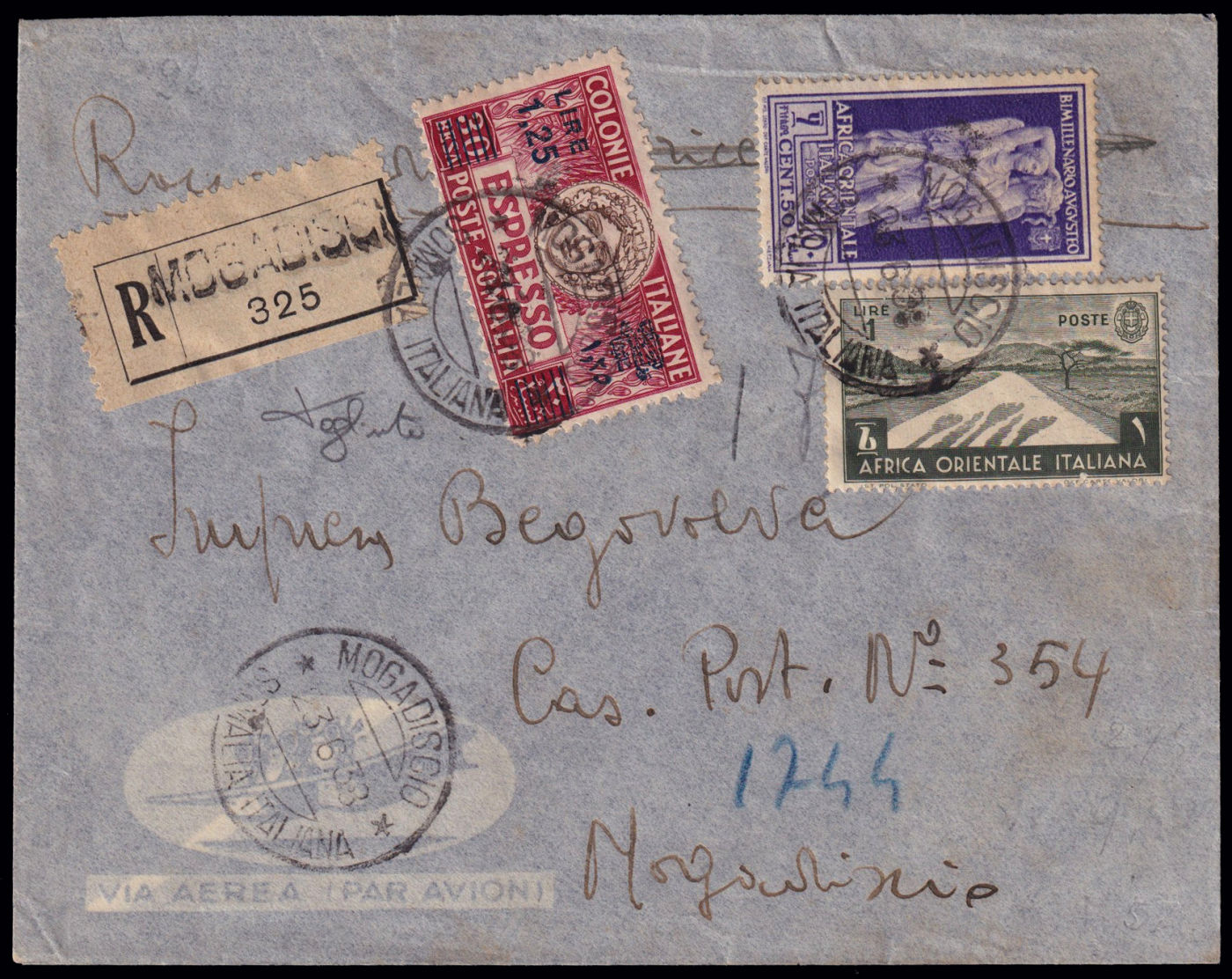 229 L imageCORRISPONDENZA ESPRESSO PER L'INTERNO. Lettera raccomandata espresso spedita nel distretto di Mogadiscio per città affrancata in perfetta tariffa 2,75 con due francobolli dell'emissione generale ed espresso da lire 1,25 su 30 (Sassone 7) tutti annullati in data 23/6/38. Uno dei pochissimi espressi per l'interno dell'AOI. Ex coll, Gabbini. (Image) (ImageA)