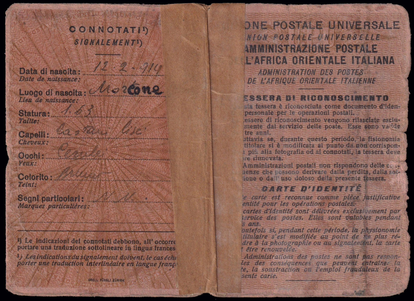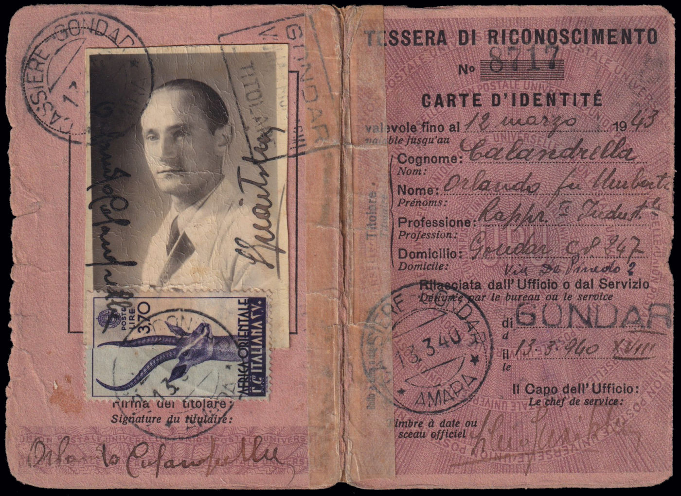 230 L imageTESSERA DI RICONOSCIMENTO POSTALE. Tessera dell'Amministrazione dell'Africa Orientale Italiana affrancata con il valore da 3,70 lire dell'emissione generale annullato col guller "Cassiere Gondar * AMARA * 13.3.40". Documento rarissimo con alcuni difetti. Ex coll. Gabbini. (Image) (ImageA)