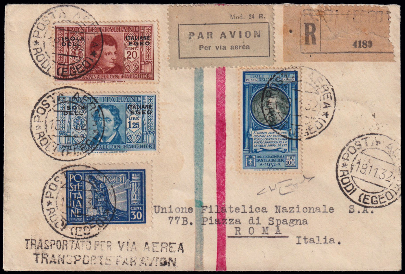 231 L imageSOCIETA' DANTE ALIGHIERI. Aerogramma spedito da Rodi per Roma il 18/11/32 ed affrancato l'alto valore della serie posta aerea (n.21) unitamente a 3 francobolli soprastampati Egeo. Timbro di arrivo. Firma di garanzia Raybaudi (Image) (ImageA)