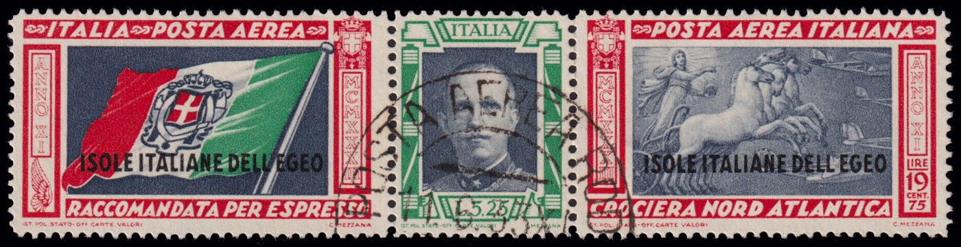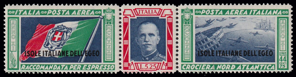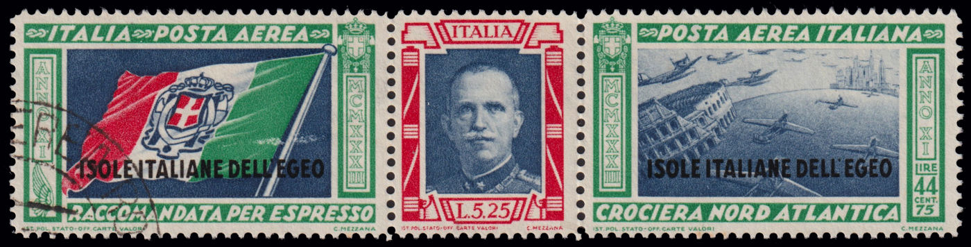 232 U image1933 CROCIERA DEL DECENNALE. La coppia di trittici soprastampati ISOLE ITALIANE DELL'EGEO, annullati. (Image) (ImageA) (ImageB) (ImageC)