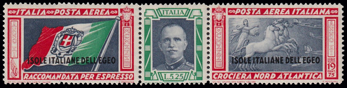233 G image1933 CROCIERA DEL DECENNALE. La coppia di trittici soprastampati ISOLE ITALIANE DELL'EGEO, nuovi con bordo di foglio superiore. (Image) (ImageA) (ImageB) (ImageC)
