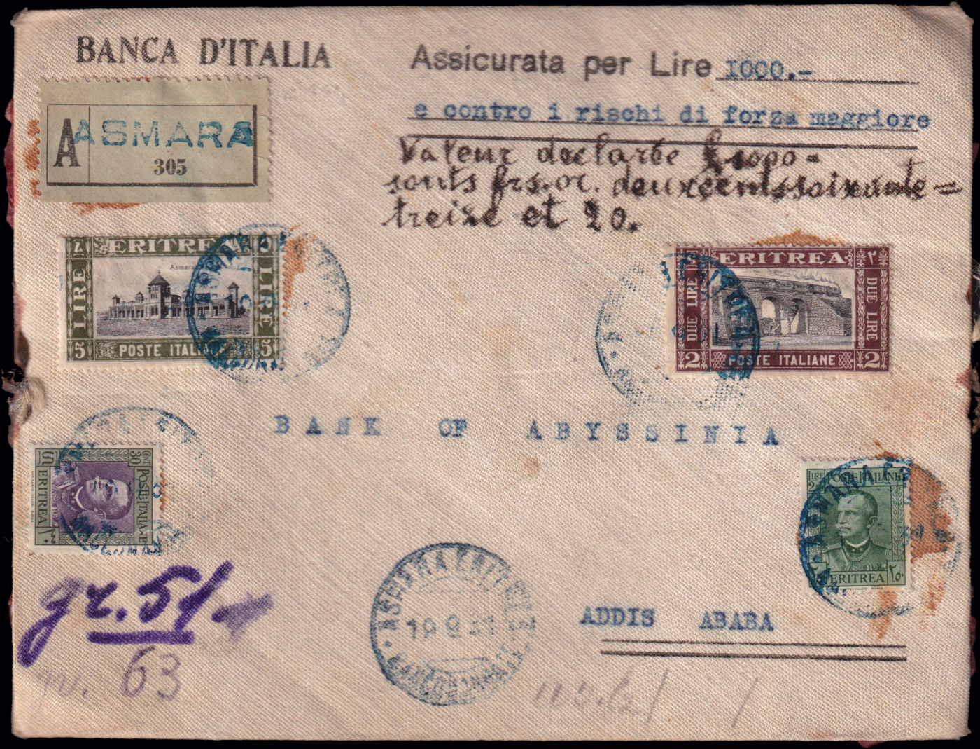 234 L imageASSICURATA 1000 LIRE ANCHE PER RISCHI DI FORZA MAGGIORE. Busta telata spedita dalla filiale della Banca di Asmara per la Banca di Abissinia di Addis Abeba il 18/9/1931 ed affrancata per complessive lire 9,80 con combinazione composta da 2 francobolli da 2 lire e 5 lire "soggetti africani" (nn.162+163) oltre a un 30 centesimi (con piccolo difetto) ed un francobollo da 2,50 lire (nn.197+202) tutti annullati col timbro postale in azzurro. Al retro grandi sigilli di ceralacca ancora intatti e spago oltre al timbro di arrivo. Delle rare assicurate per Forza Maggiore spedite dagli uffici postali delle Colonie italiane nessuna altra è a noi nota diretta per l'interno dell'Africa. (Image) (ImageA)