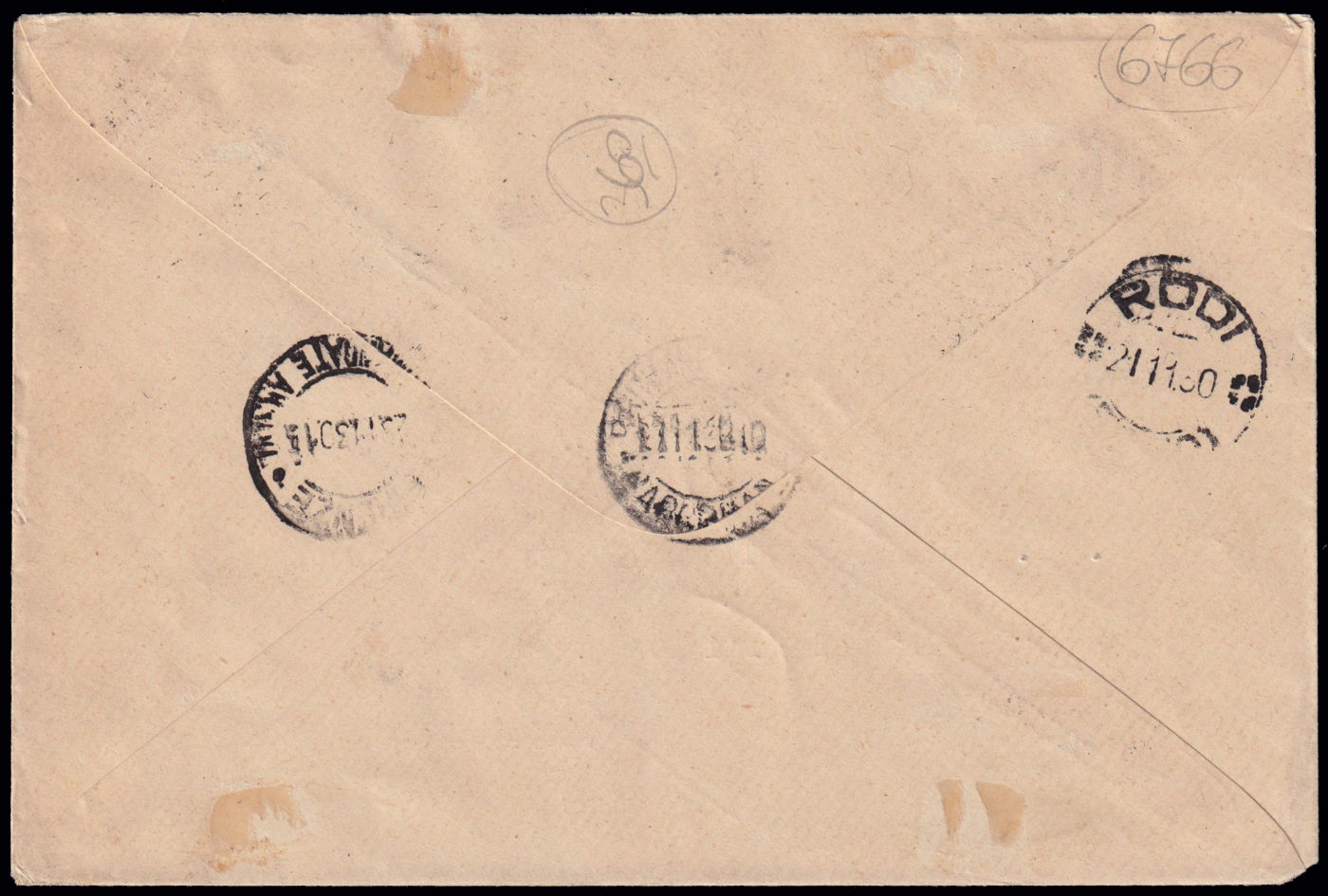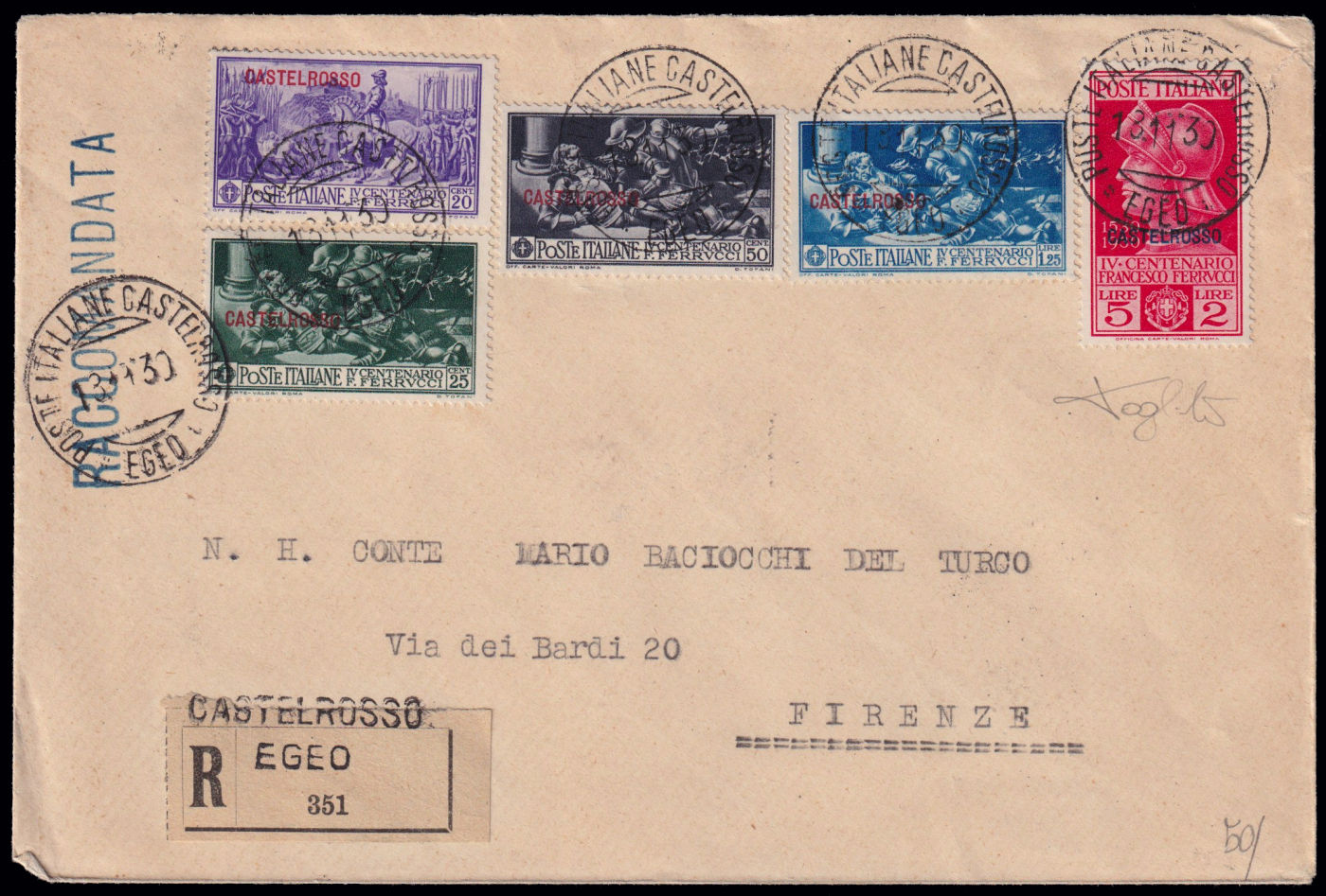 235 L image1930 EGEO - FERRUCCI. Giro completo dei 70 francobolli soprastampati di posta ordinaria che affrancano 14 raccomandate (nn,.12/16) compresa Castellorizzo. Timbri di transito e arrivo al retro. Ben conservate. (Image) (ImageA)
