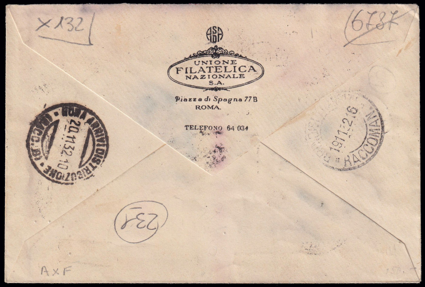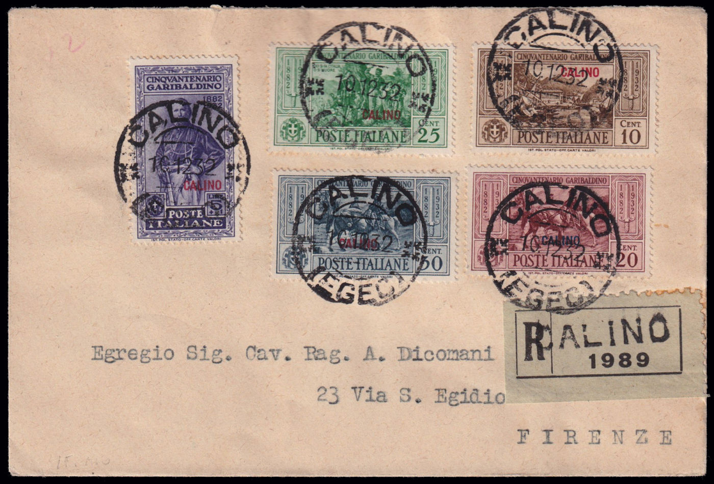 236 L image1932 EGEO - GARIBALDI. Giro completo dei 140 francobolli di posta ordinaria con soprastampa delle 14 isole (incluso Castelrosso) che affrancano 28 raccomandate (nn. 17/26) tutte spedite a Firenze. Timbri di arrivo al retro. Ben conservate. (Image) (ImageA)