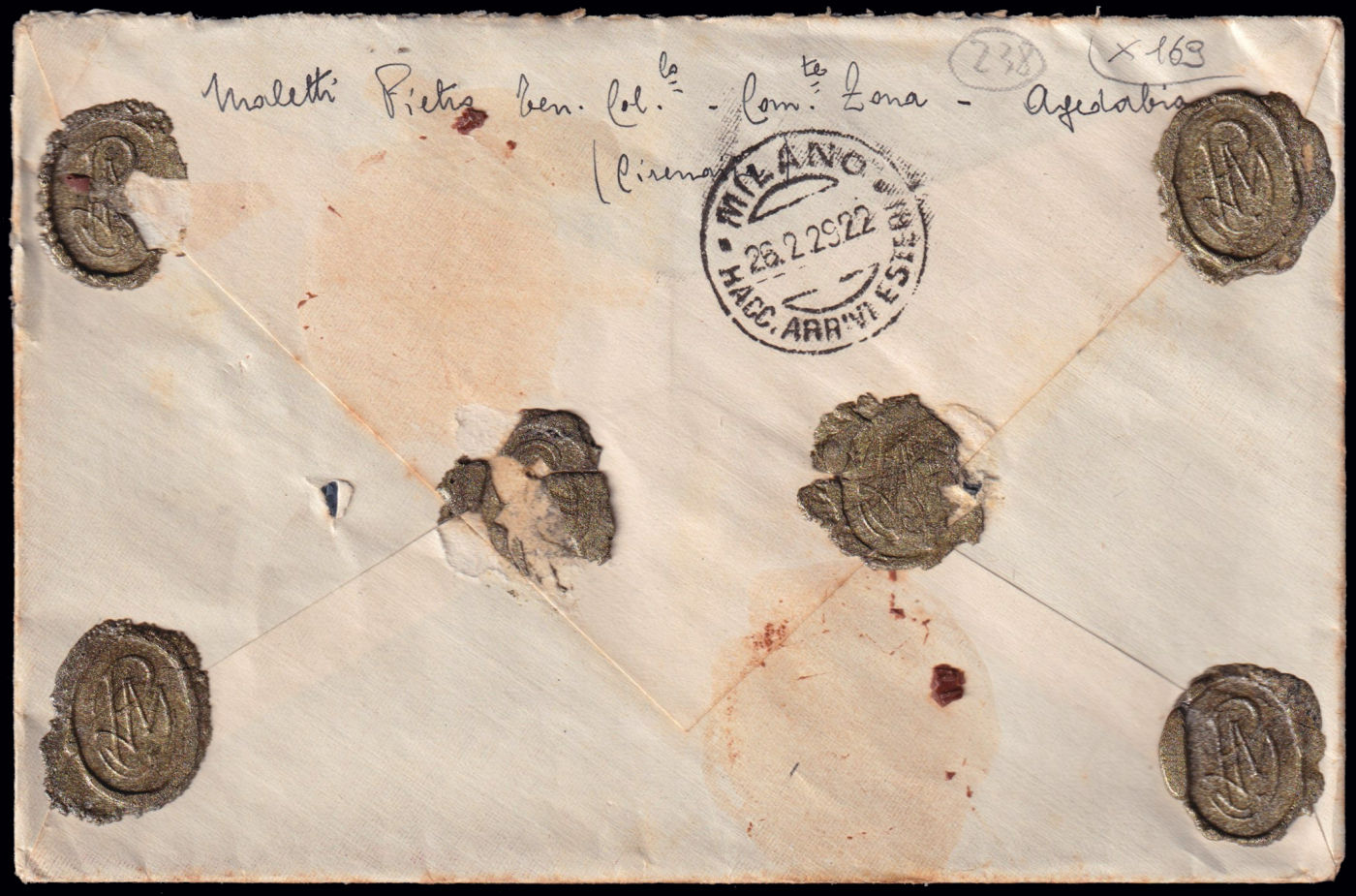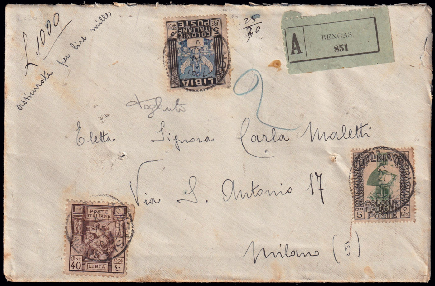 238 L imageASSICURATA LIRE 1000. Busta spedita da Bengasi per Milano il 22/2/1929 ed affrancata per complessive 5,45 lire con 2 francobolli della serie Pittorica fra cui l'alto valore da 5 lire (Sassone nn.23+31+55) ed il 40 centesimi "Sibilla libica". Al retro timbri di transito e arrivo oltre ai sigilli di ceralacca. Rare le assicurate da 1000 lire spedite dalle Colonie italiane. (Image) (ImageA)