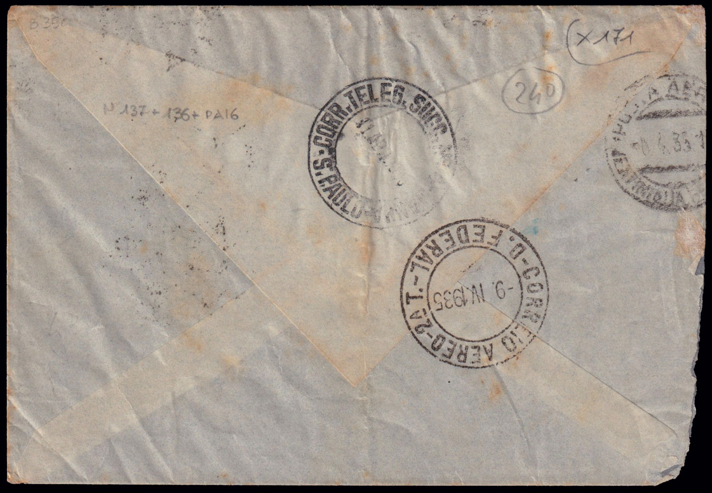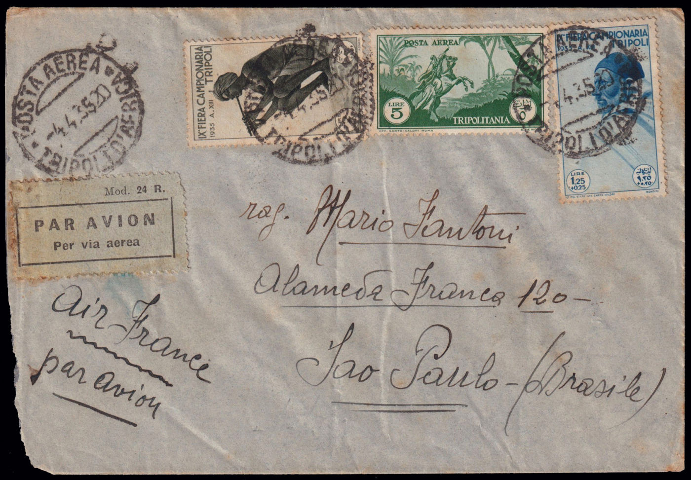 240 L imageIX FIERA CAMPIONARIA DI TRIPOLI. Lettera spedita via aerea con Air France da Tripoli per il Brasile in data 4/4/35 ed affrancata in tariffa per complessive lire 8,25 con un 5 lire di posta aerea di Tripolitania e due valori della serie speciale commemorativa da 1,25 lire ed il rarissimo 2 lire (nn.136+137+Tripolitania 23). Timbri di transito e arrivo al retro. Alcuni difetti ma eccezionale uso di alto valore commemorativo su busta non filatelica per il Sud America. (Image) (ImageA)