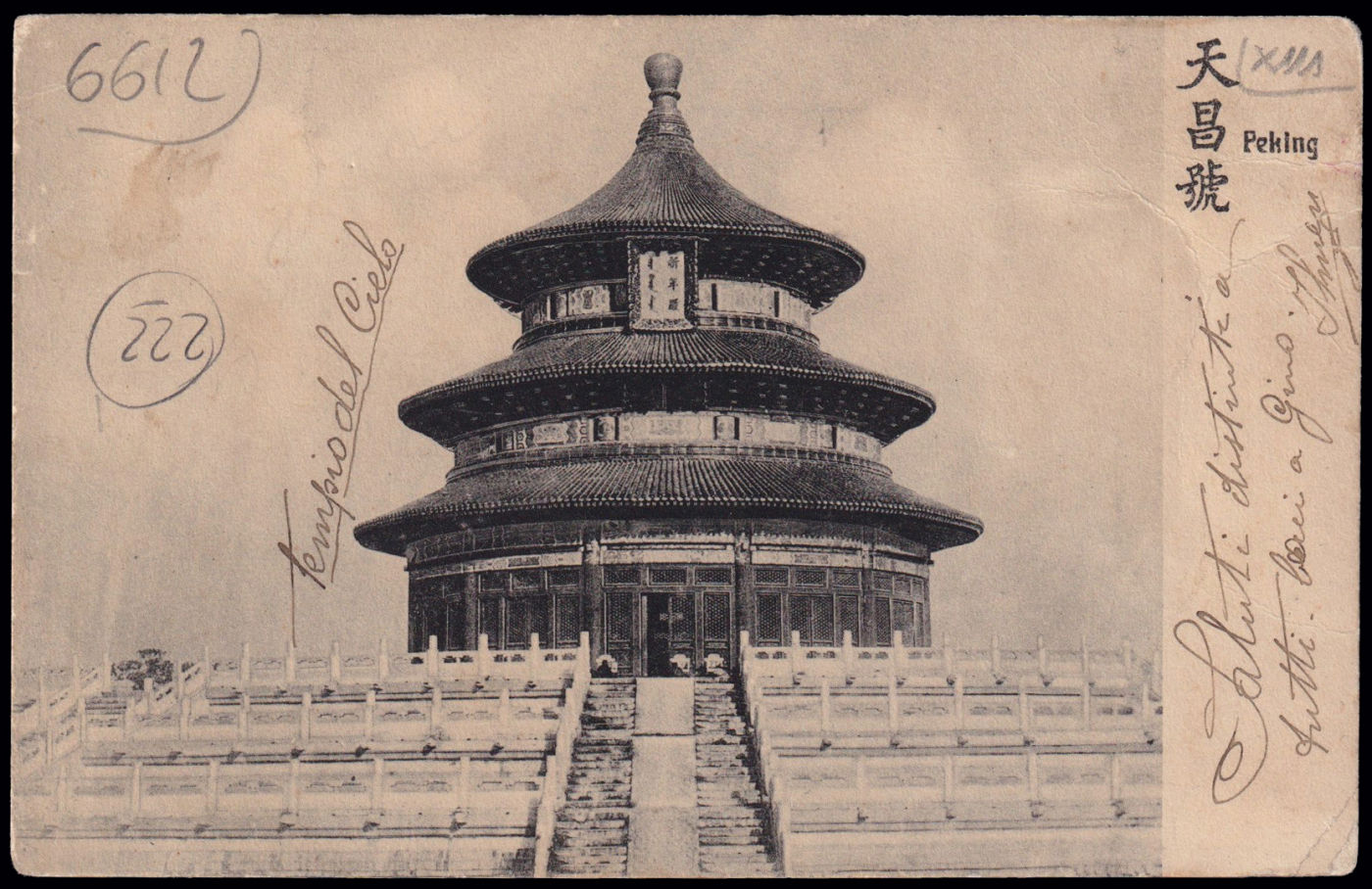 222 L imageRR POSTE ITALIANE PECHINO - CINA. Guller datato 10/12/19 che annulla cartolina del Tempio del Cielo (Pechino) spedita ad Alessandria ed affrancata con un francobollo da 20 centesimi su 50 centesimi, un francobollo da 10 centesimi su 25 centesimi e il raro francobollo espresso da 30 centesimi (Sassone nn.25+28+Ex1). Firma di garanzia Diena. (Image) (ImageA)