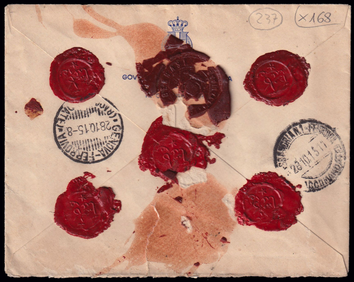 237 L imageASSICURATA PER FORZA MAGGIORE. Busta assicurata per lire 300 spedita da Bengasi per Alessandria il 23/10/1915 ed affrancata in tariffa esatta 55 centesimi con 3 francobolli soprastampati Libia. A lato manoscritto FM e ripetuto sul talloncino di assicurazione. Al retro timbri di transito e arrivo e sigilli di ceralacca. Molto rare le assicurate anche per Forza Maggiore dalle Colonie italiane. (Image) (ImageA)