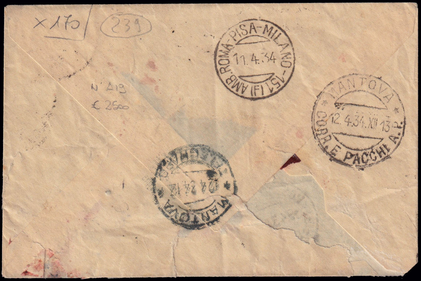 239 L imageVIII FIERA CAMPIONARIA DI TRIPOLI. Il rarissimo espresso aereo da 2,25 lire (Sassone A19) che affranca in tariffa lettera spedita da Tripoli per Mantova il 9/4/34. Timbri di transito e arrivo al retro. Busta sciupata ma probabilmente unica non filatelica. (Image) (ImageA)