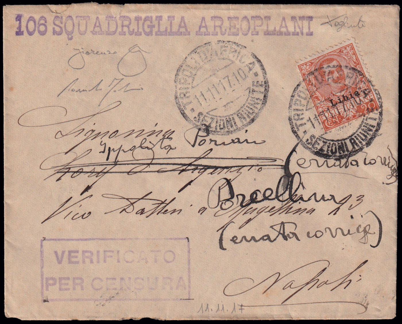 PRIMA GUERRA MONDIALE - TIMBRI DI REPARTO DELL'AVIAZIONE ITALIANA IN CIRENAICA E TRIPOLITANIA. 106 SQUADRIGLIA AEROPLANI, timbro lineare viola impresso su lettera spedita da Tripoli per Napoli il 11/11/1917 ed