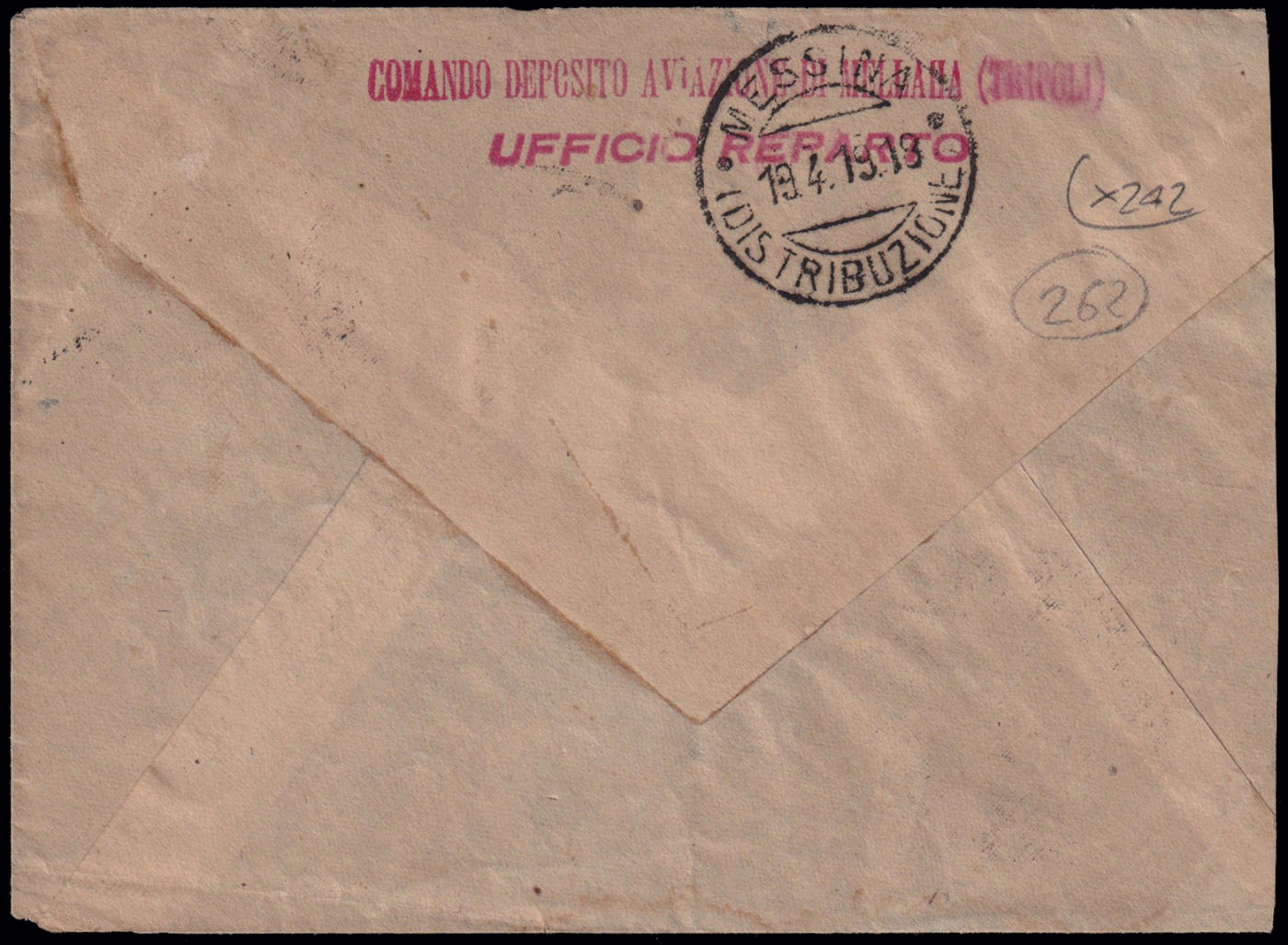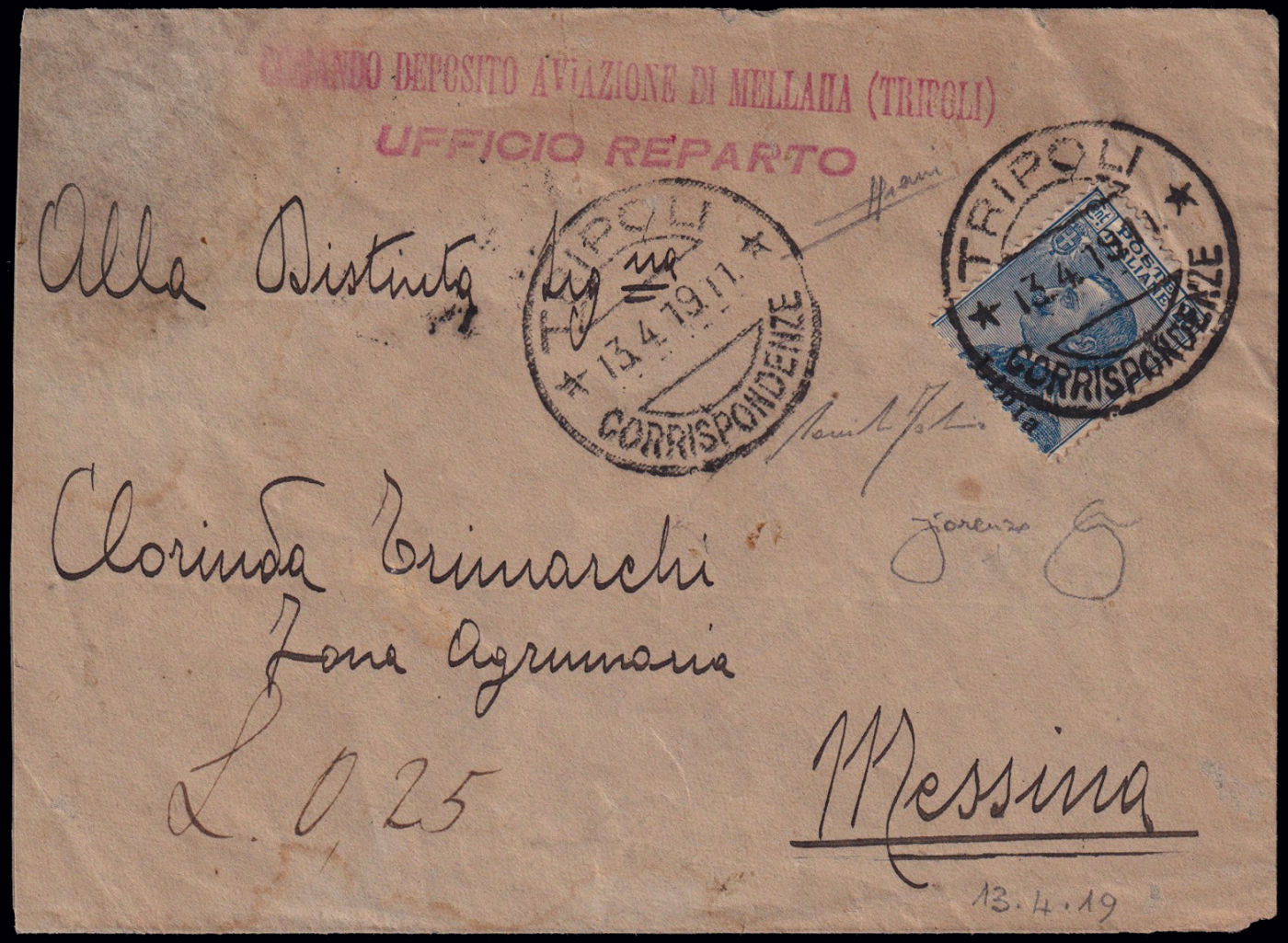 spedita da Tripoli per Messina il 13/4/19 ed affrancata con un francobollo da 25 c. soprastampato Libia. Al retro timbro di arrivo e lineare ripetuto. Riprodotta a pagina 181 del libro "Aerofilia Italiana - Catalogo dei Timbri di reparto