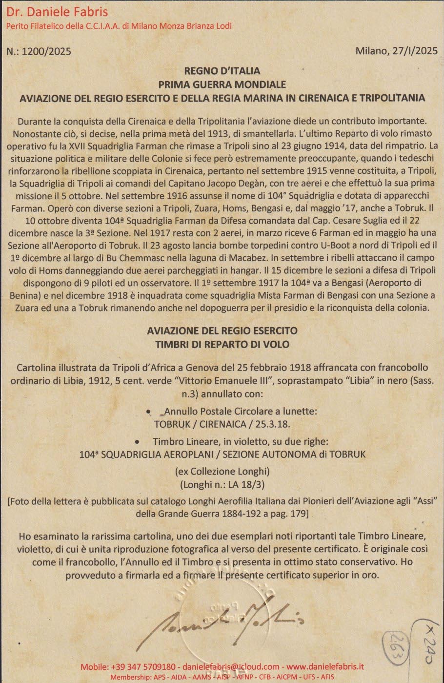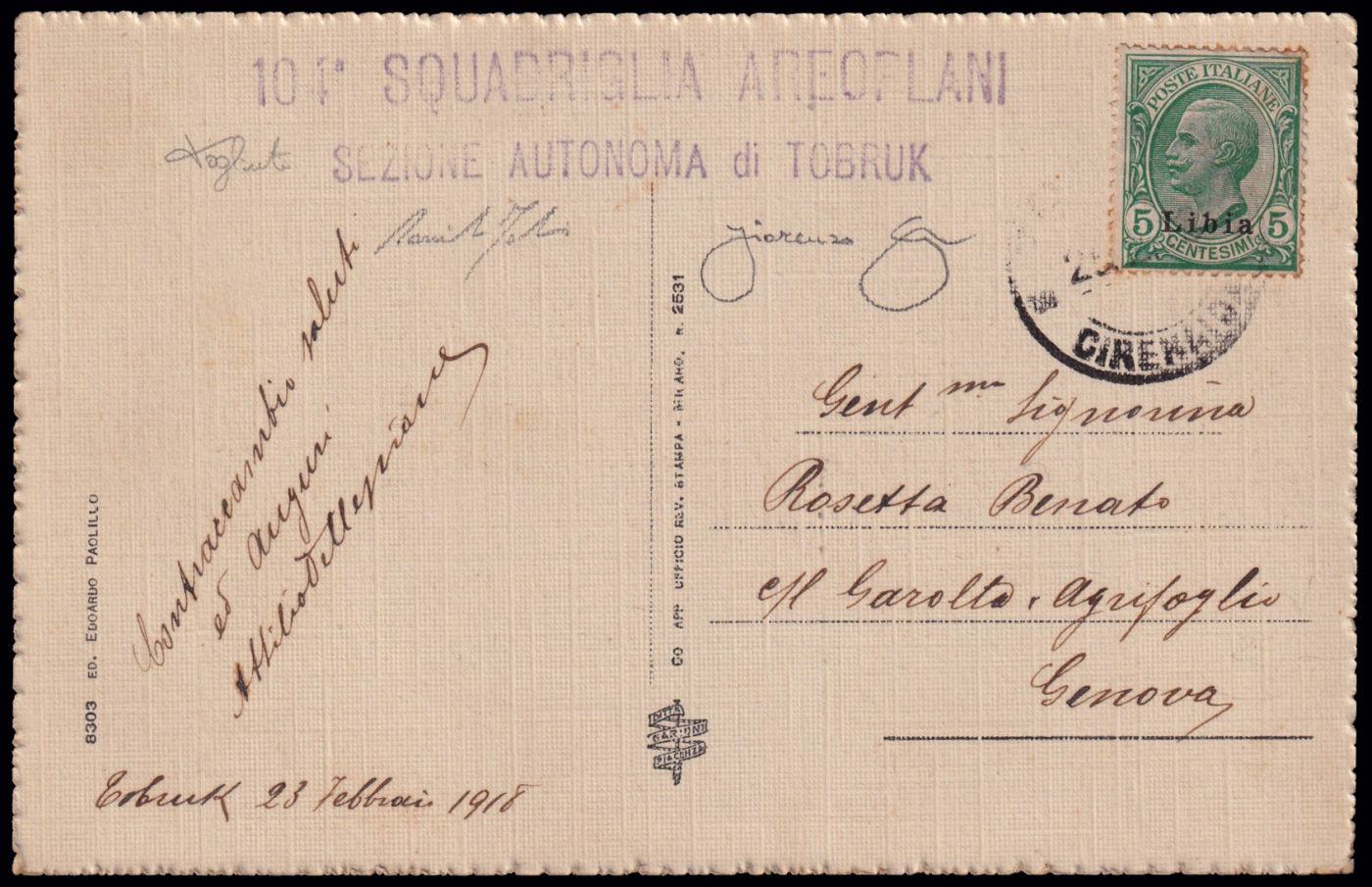 Tobruck per Genova il 23/2/1918 ed affrancata con un francobollo da 5 c. soprastampato Libia. Riprodotta a pagina 179 del libro "Aerofilia Italiana - Catalogo dei Timbri di reparto dell'Aviazione". Firma di garanzia F. Longhi. Dettagliato certificato