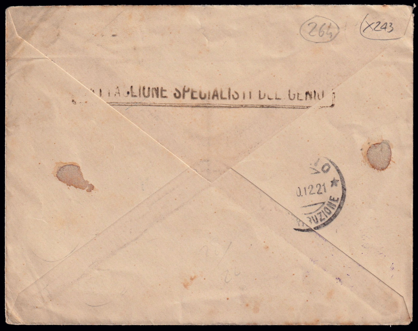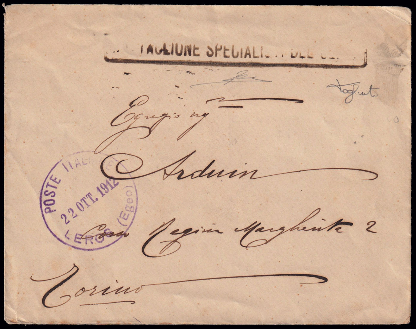 PRIMA GUERRA MONDIALE - TIMBRI DI REPARTO DELL'AVIAZIONE ITALIANA IN EGEO. BATTAGLIONE SPECIALISTI DEL GENIO, timbro riquadrato nero impresso su busta (e ripetuto al retro) spedita da Lero per Torino il 22/10/1912.