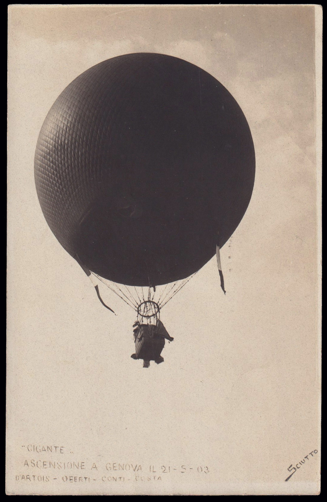 1903 GENOVA - ASCENSIONE LIBERA DEL PALLONE "GIGANTE". Cartolina fotografica Sciutto, nuova. Riprodotta a pagina 20 del libro "Aerofilia italiana ed. 2007" di F. Longhi. Longhi 38. Rara. (Image) (ImageA)