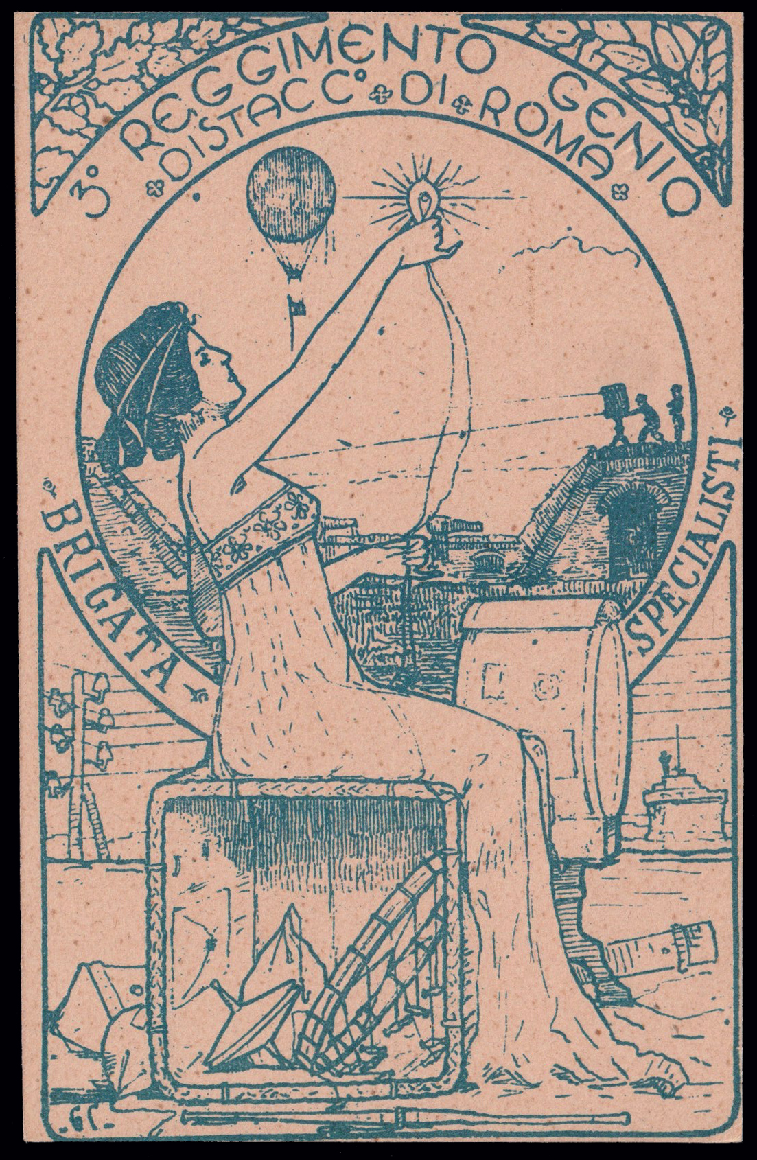 1903 ROMA - BRIGATA SPECIALISTI 3° REGGIMENTO DEL GENIO. Cartolina verticale color azzurro, nuova. Riprodotta a pagina 27 del libro "Aerofilia Italiana - nuova edizione" di F. Longhi. Longhi 41d (nuova numerazione). (Image) (ImageA)