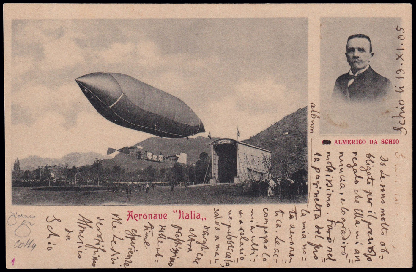 1905 SCHIO - VOLI DI PROVA DELL'AERONAVE. Cartolina orizzontale, nuova con scritto e autografo di Amerigo da Schio, nuova. Riprodotta a pagina 34 del libro "Aerofilia Italiana - nuova edizione" di F. Longhi. Firma di