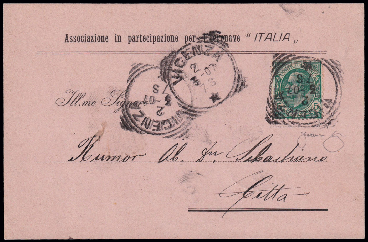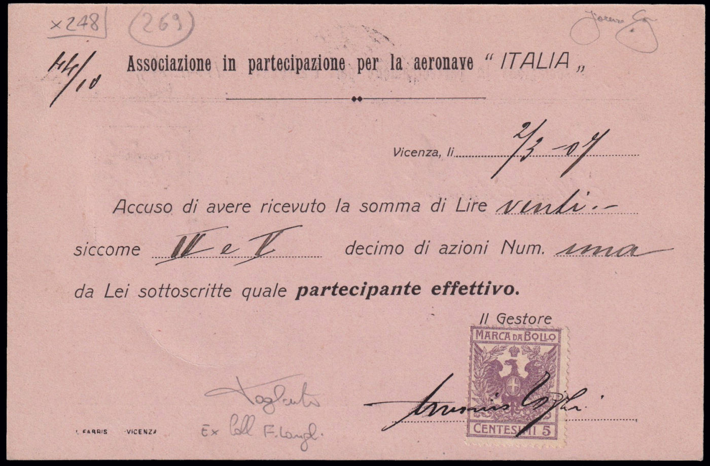 1905 SCHIO - VOLI DI PROVA DELL'AERONAVE "ITALIA". Modulo ricevuta versamento azioni, viaggiato in data 2/3/1907. Riprodotta a pagina 25 del libro "Aerofilia Italiana - ed. 2007" di F. Longhi. Firma di garanzia F