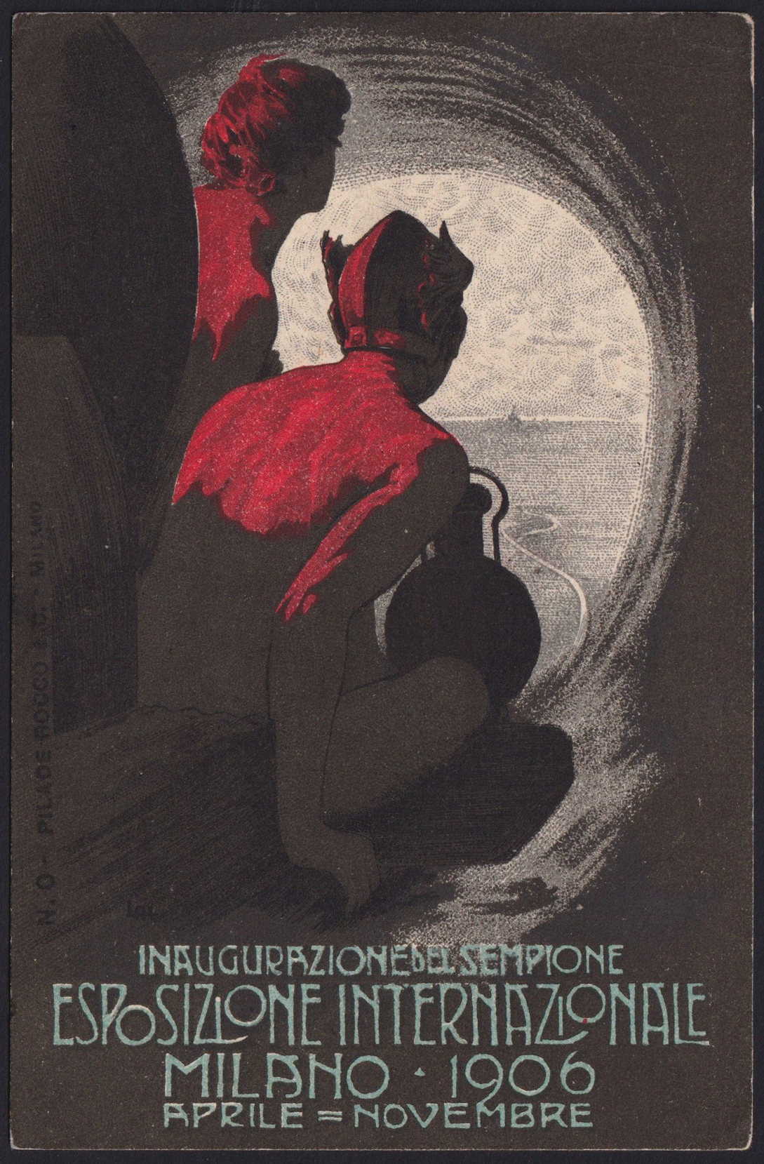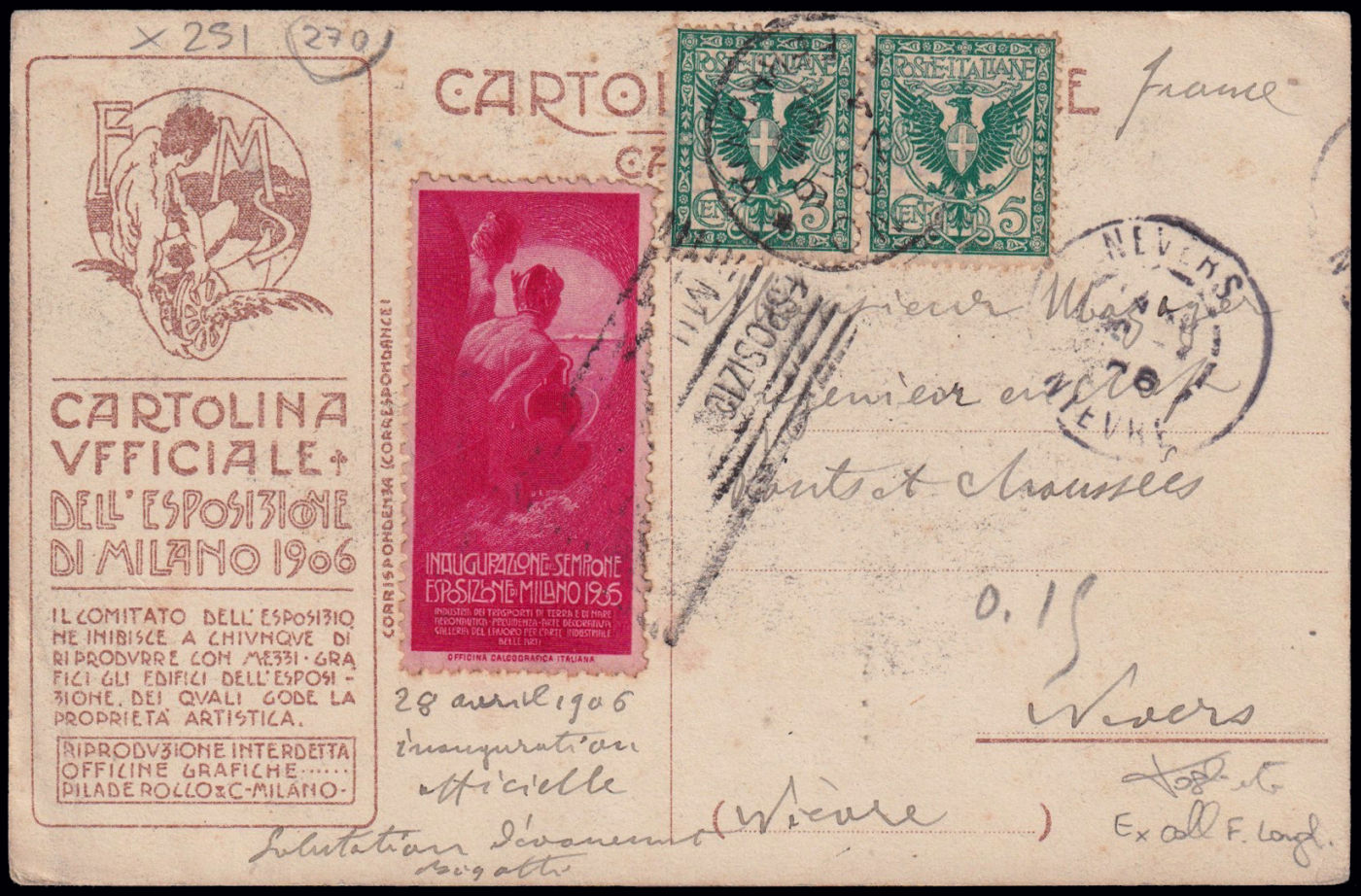 1906 MILANO - ESPOSIZIONE INTERNAZIONALE. Cartolina policroma dis. Metlicovitz, edit. Pilade & Rocco, spedita in Francia il 28/4/1906, giorno dell'inaugurazione ufficiale con l'erinnofilo rosso annullato dal timbro