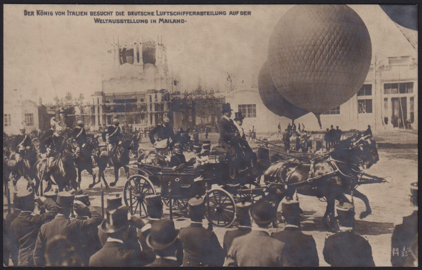 1906 MILANO - ESPOSIZIONE INTERNAZIONALE. Cartolina tedesca della visita del Re al parco dei palloni germanici, nuova. Riprodotta a pagina 27 del libro "Aerofilia Italiana - ed. 2007" di F. Longhi. Firma di garanzia