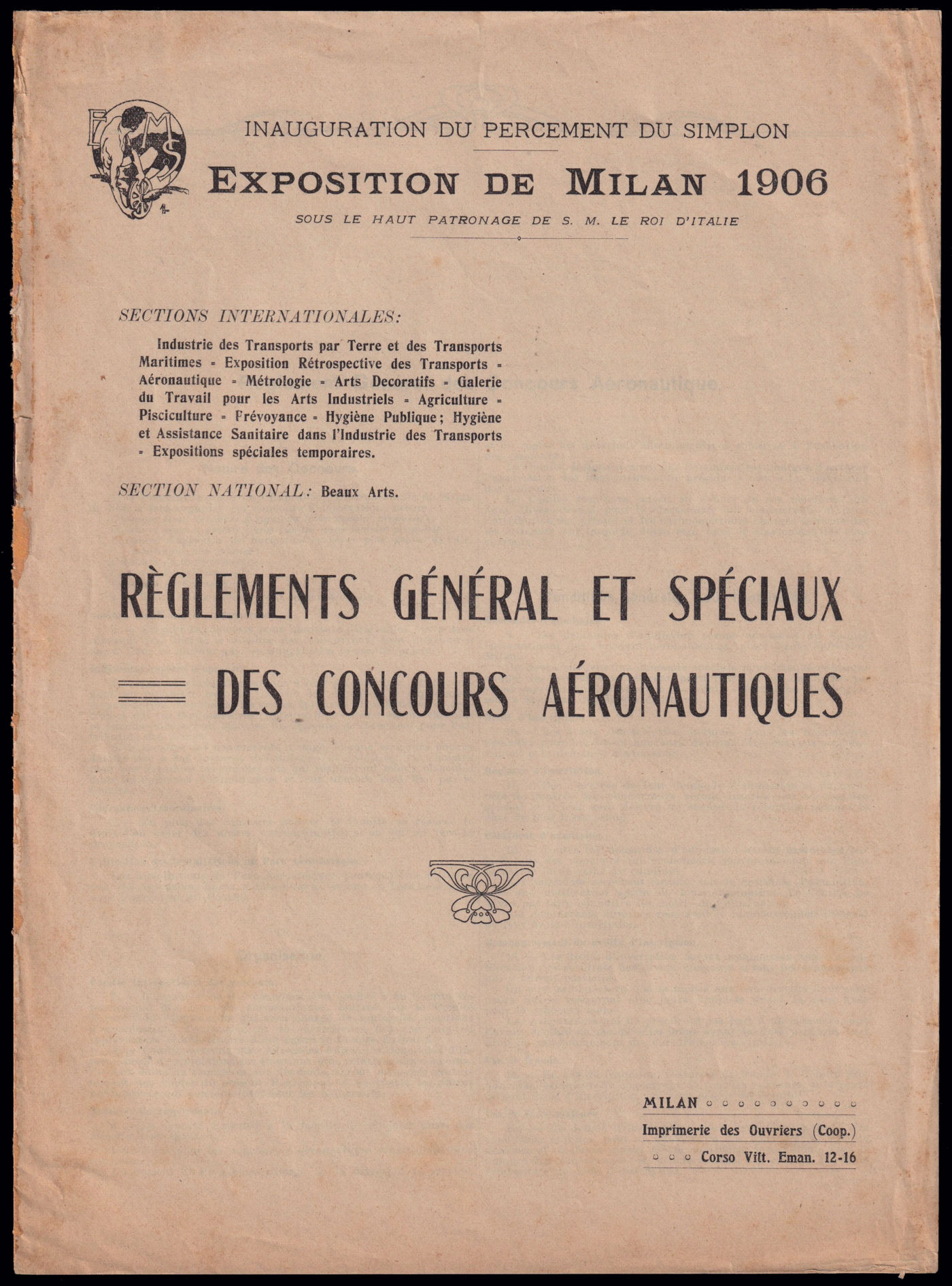 1906 MILANO - ESPOSIZIONE INTERNAZIONALE. REGLEMENT GENERAL ET SPECIAUX = DES CONCOURS AERONAUTIQUES, regolamento in lingua francese di 16 pagine con tutti gli schemi dei volumi degli aerostati gonfiati con gas