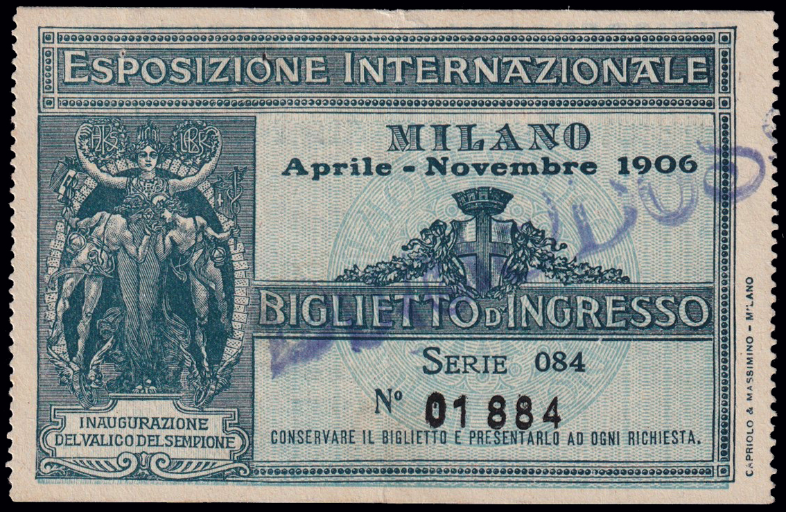 1906 MILANO - ESPOSIZIONE INTERNAZIONALE. Biglietto d'ingresso verde e ardesia (esistono 5 tipi differenti). Longhi 77. (Image) (ImageA)