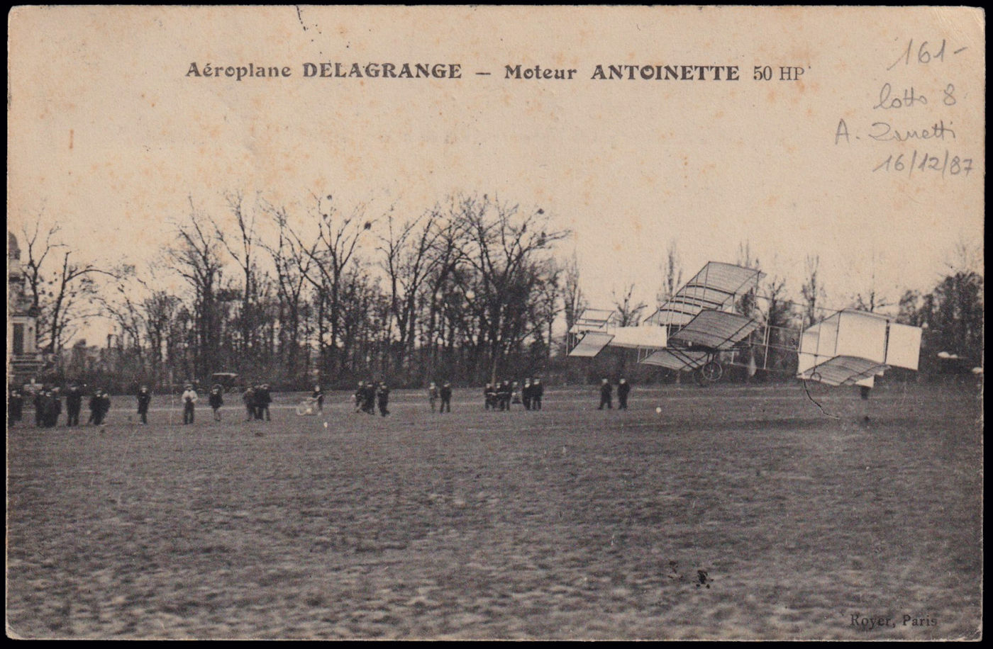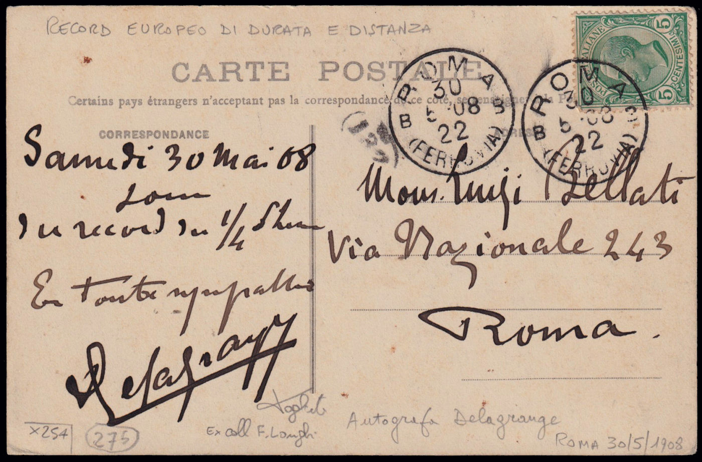 1908 PRIMI ESPERIMENTI DI VOLO IN ITALIA - ROMA. Cartolina francese "aeroplane DELAGRANGE" spedita da Roma per città il 30/5/1908 scritta autografa dal pilota francese che la firma di suo pugno De Lagrange, nel giorno