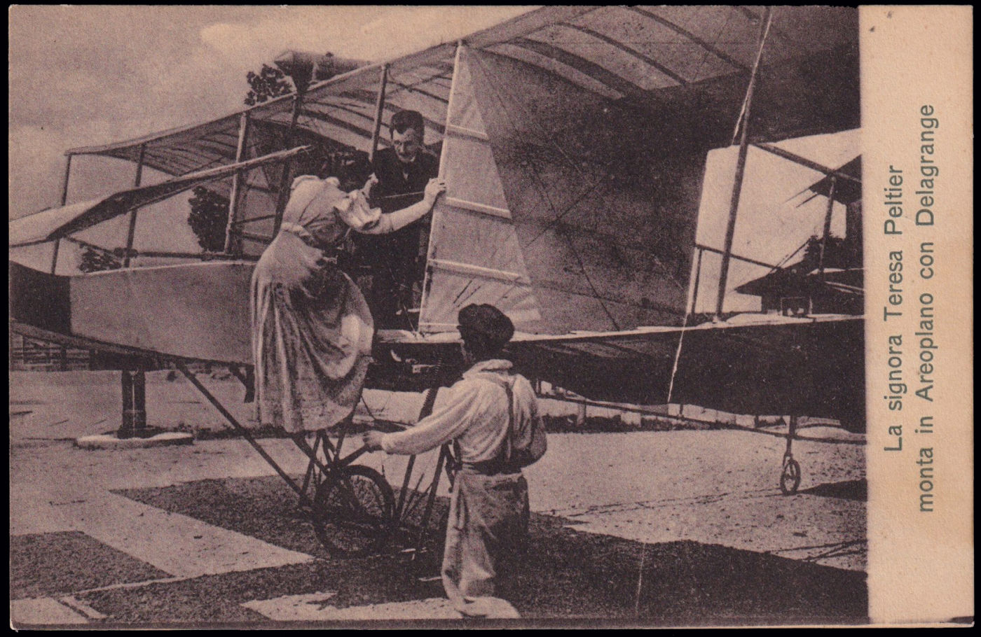 1908 PRIMI ESPERIMENTI DI VOLO IN ITALIA - TORINO. La signora Teresa Peltier monta in Aeroplano con Delagrange, nuova. Longhi 126. Rara.