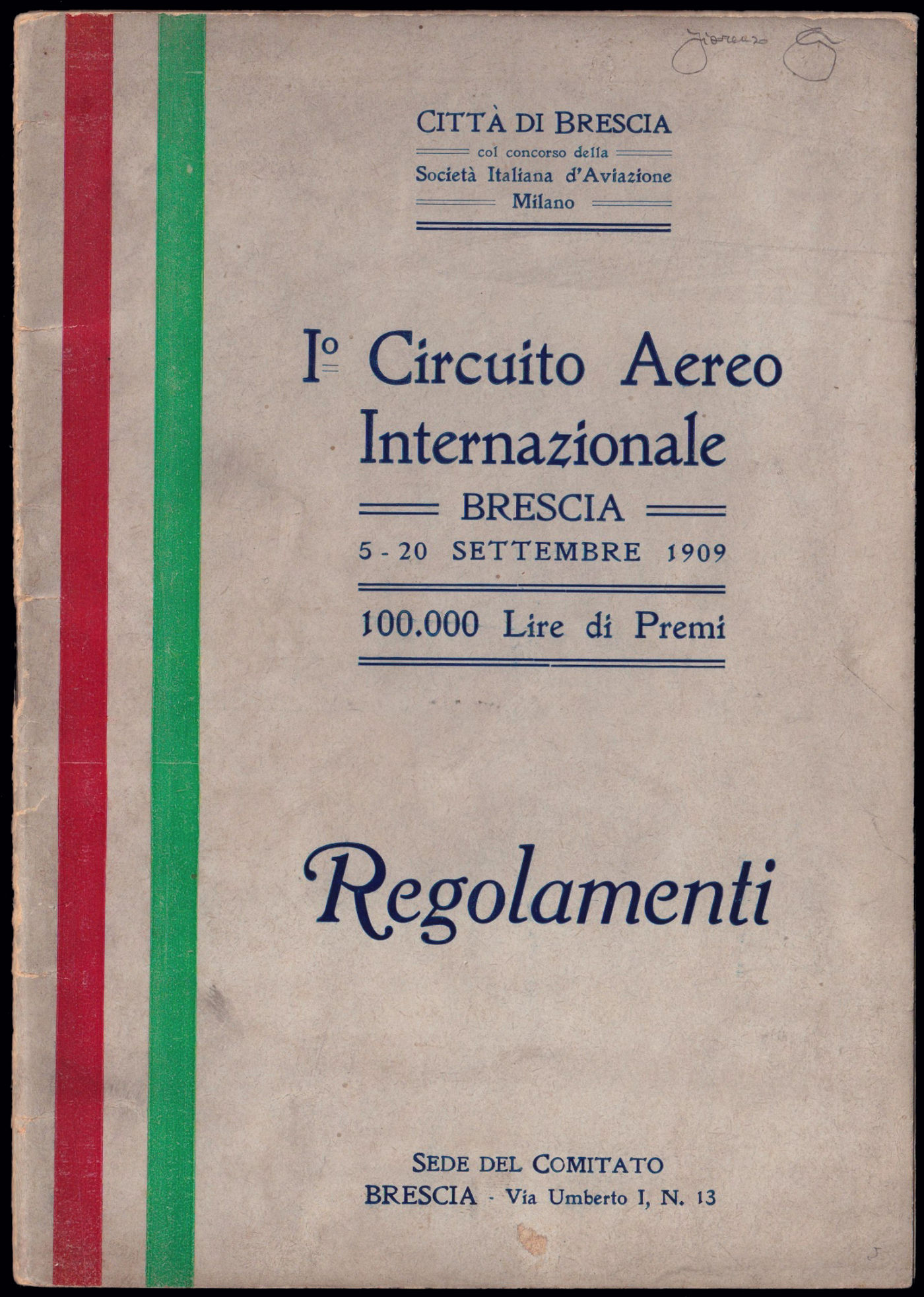 1909 BRESCIA / I° CIRCUITO AEREO INTERNAZIONALE. Regolamento in italiano di 34 pagine con la cartina del campo di aviazione in fondo. Riprodotta a pagina 61 del libro "Aerofilia Italiana - nuova edizione" di F. Longhi.