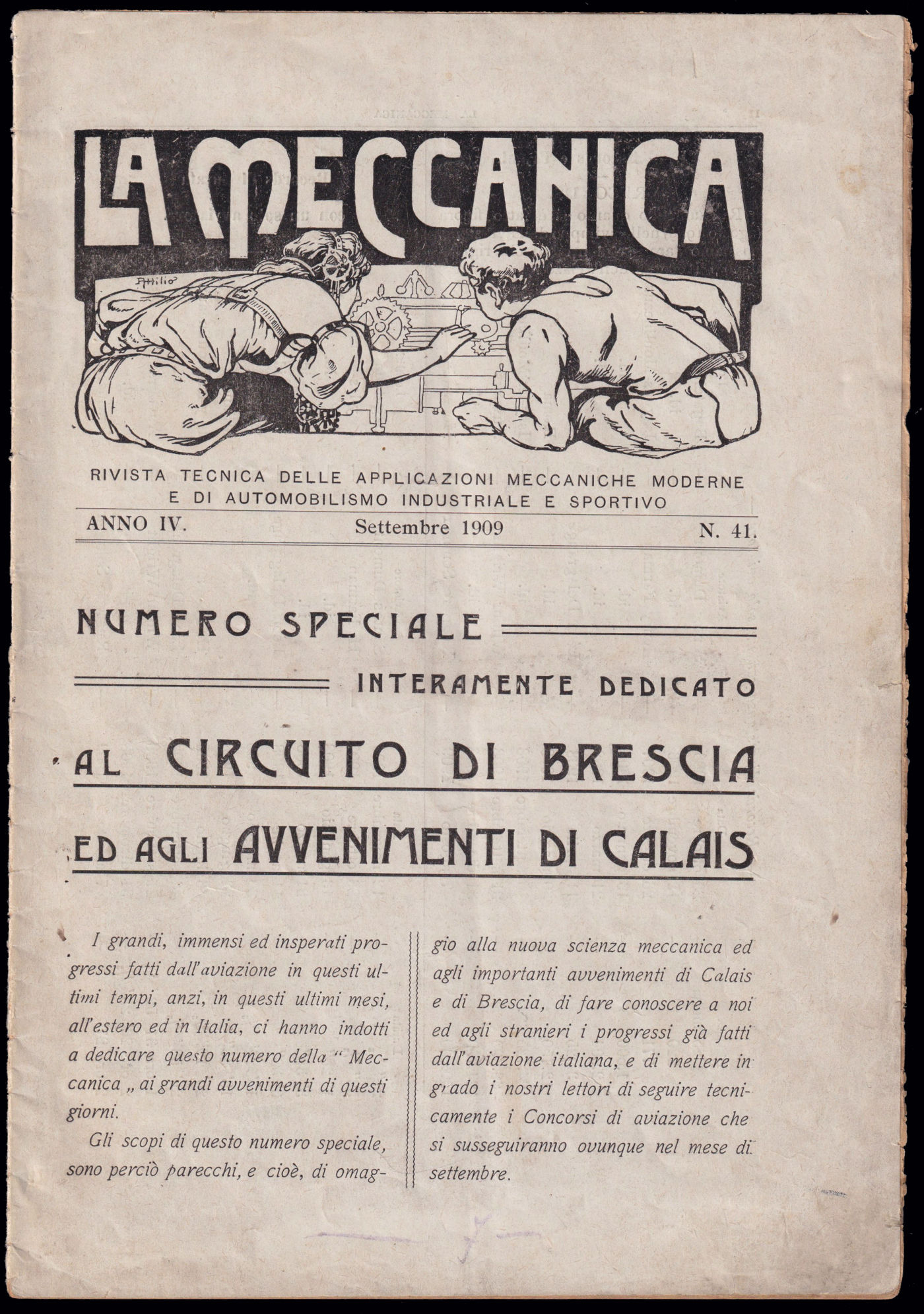 1909 BRESCIA / I° CIRCUITO AEREO INTERNAZIONALE. Numero speciale interamente dedicato al Circuito edito da "La Meccanica", rivista tecnica di Torino. Longhi 190. Piccola mancanza d'angolo nella copertina al retro.