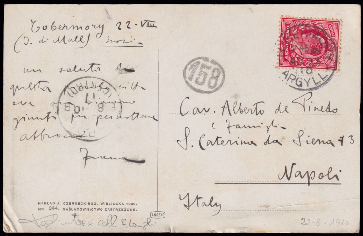1910 DE PINEDO. Cartolina spedita da Tobermory (Scozia) al papà Alberto. Firma autografa Francesco. A poca distanza, a Lanark, dal 6 al 13 agosto si svolse l'INTERNATIONAL AVIATION MEETING al quale prese parte B.