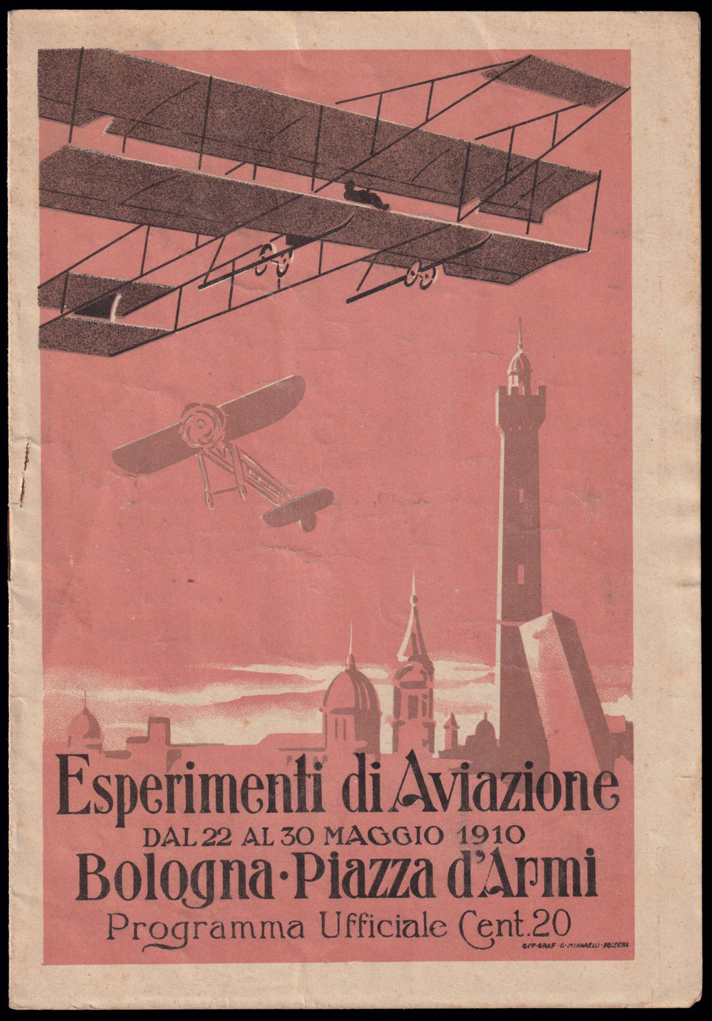 1910 BOLOGNA / ESPERIMENTI DI AVIAZIONE. Programma ufficiale da 20 centesimi con copertina policroma come la cartolina ufficiale, 4 pagine con l'elenco Aviatori, i segnali ed il codice dei segnali. Con qualche brunitura