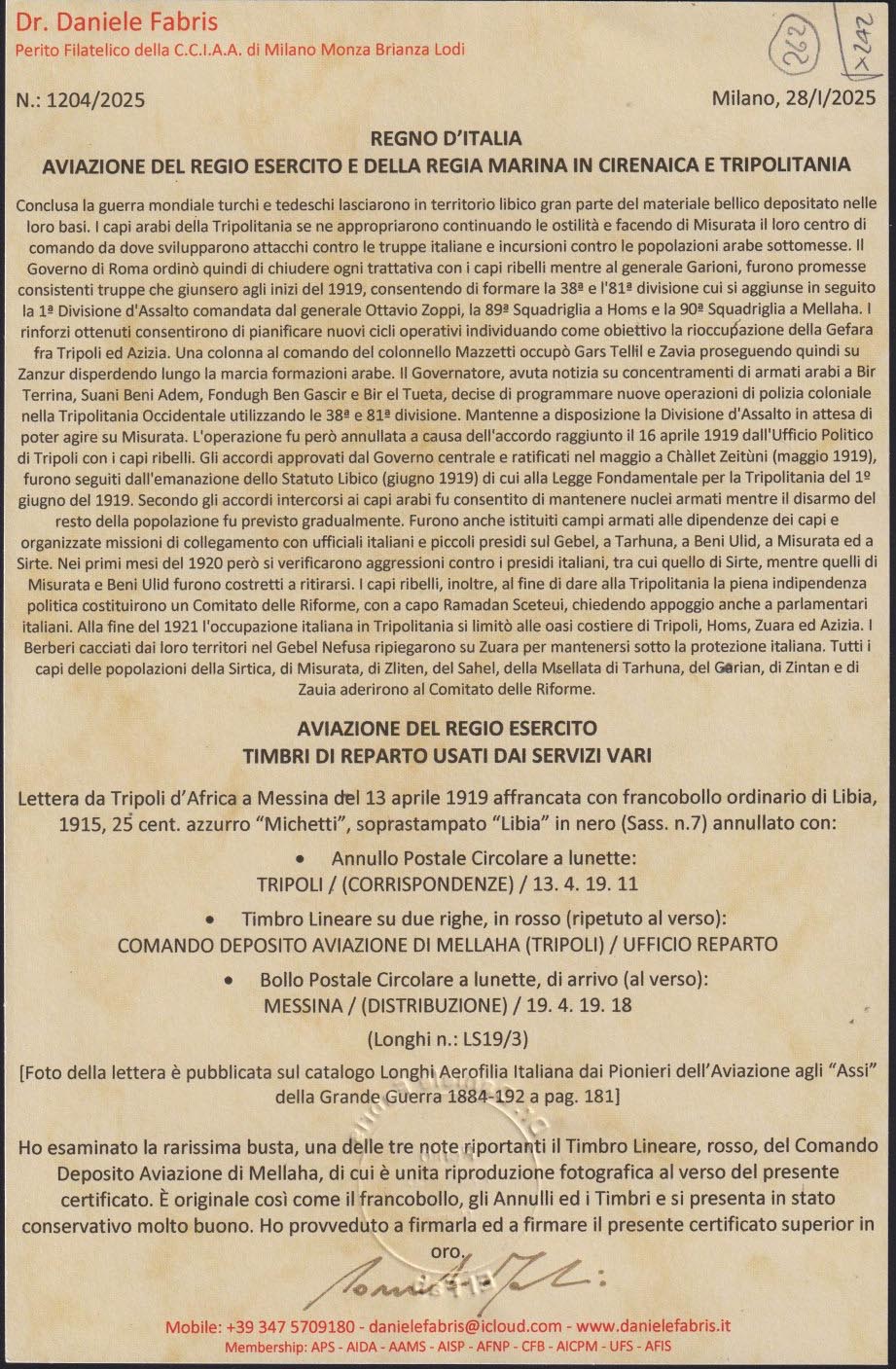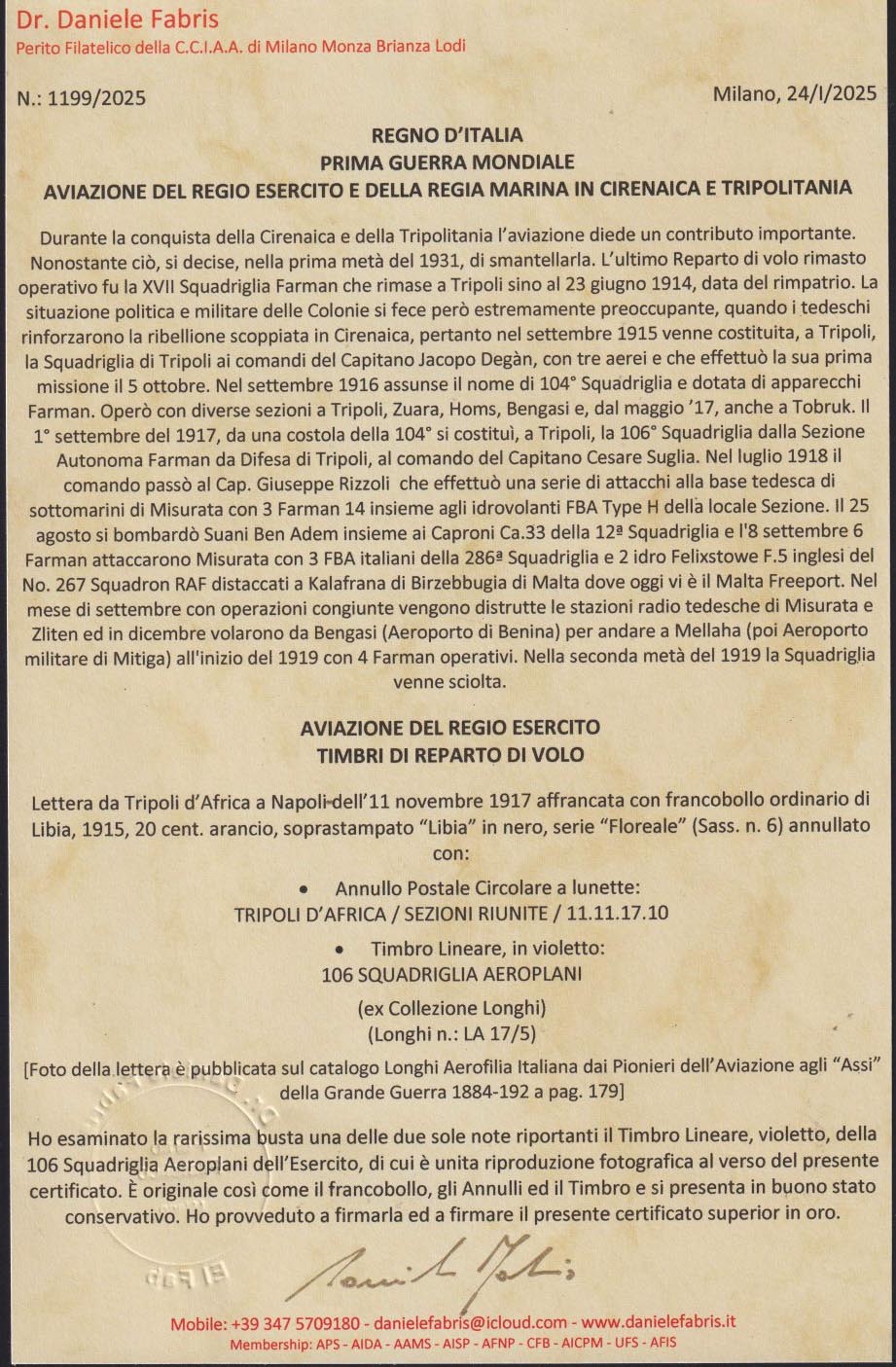 dell'Aviazione". Firma di garanzia F. Longhi e Sorani. Dettagliato certificato "superior oro" Fabris (2025). Tre impronte note su busta. Longhi LS19/3. (Image) (ImageA)