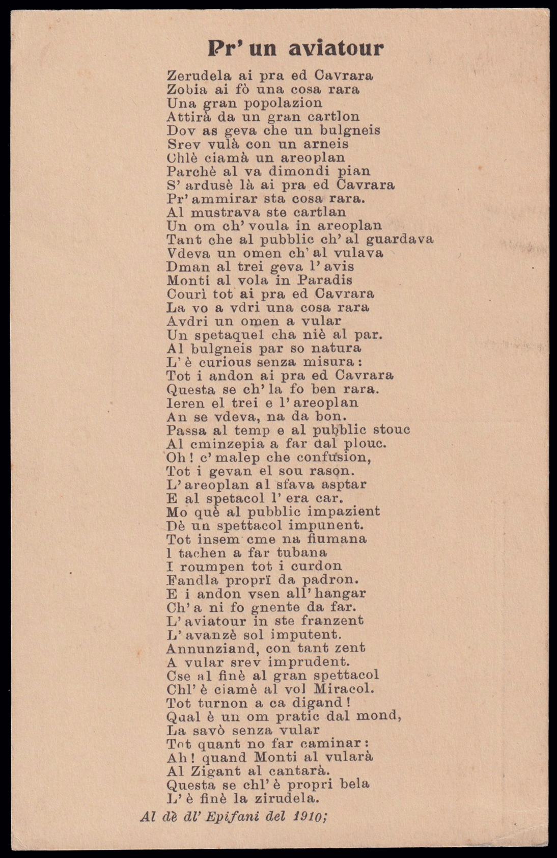 1910 BOLOGNA / PRIMO SPETTACOLO DI AVIAZIONE. Cartolina ricordo con zerudella intitolata "Pr'un aviatur". Riprodotta a pagina 65 del libro "Aerofilia Italiana - nuova edizione" di F. Longhi. Longhi 214. (Image) (ImageA)