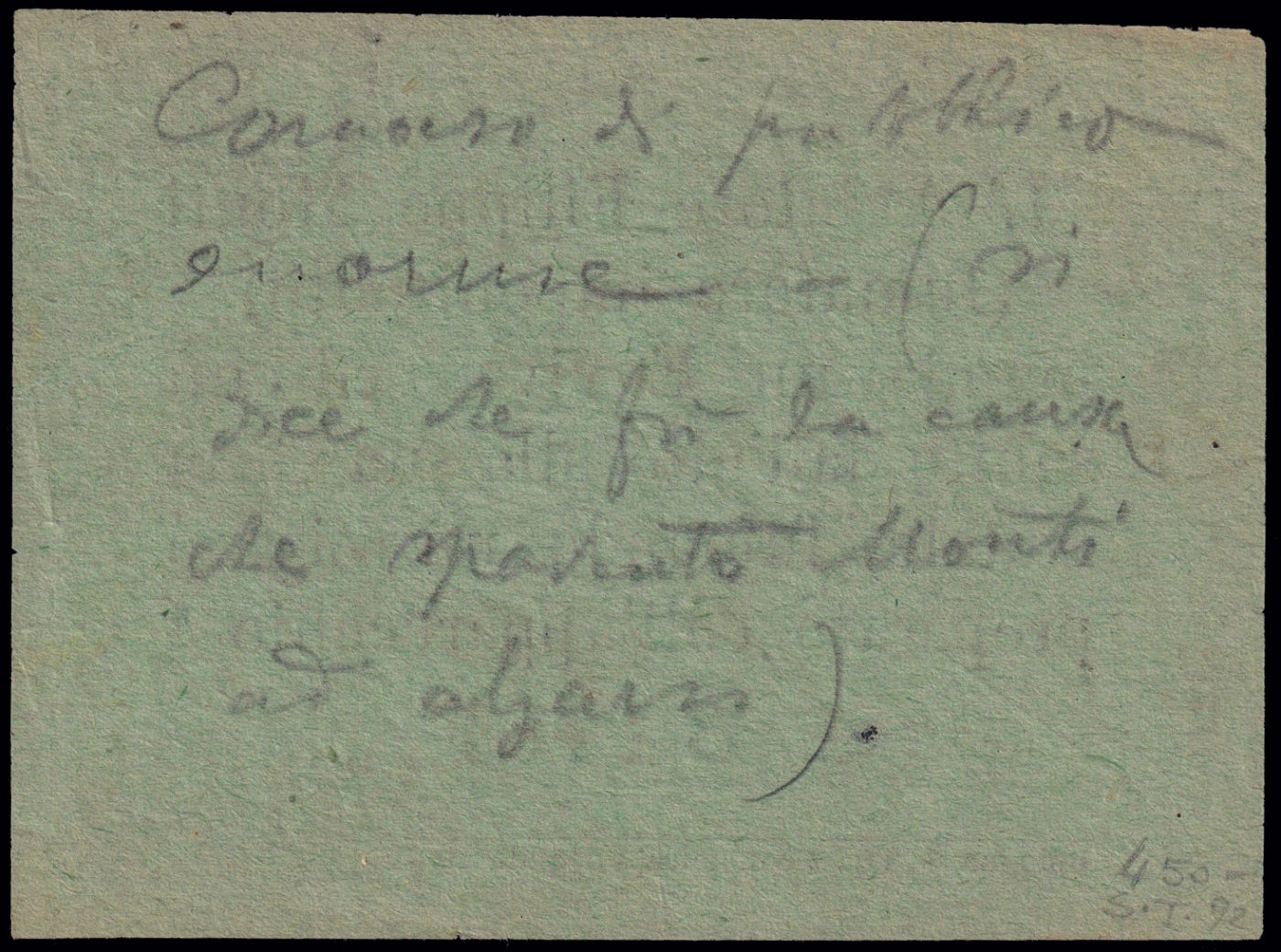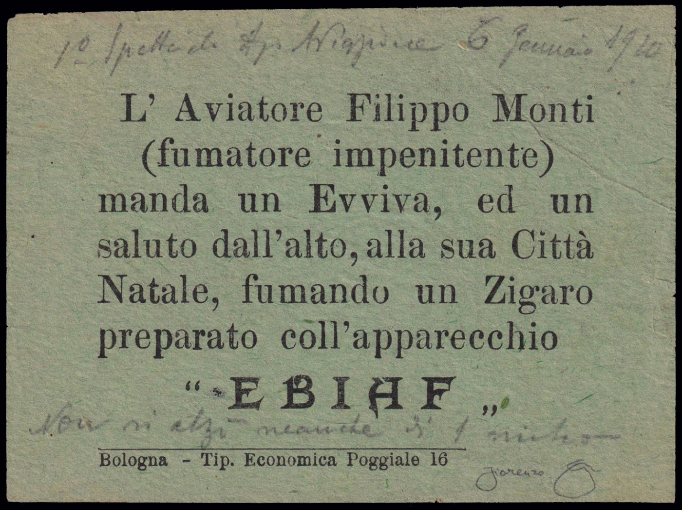 1910 BOLOGNA / PRIMO SPETTACOLO DI AVIAZIONE. Volantino orizzontale su carta verde (Bologna - Tip. Economica Poggiale 16). Riprodotta a pagina 44 del libro "Aerofilia Italiana - edizione 2007" di F. Longhi. Firma di